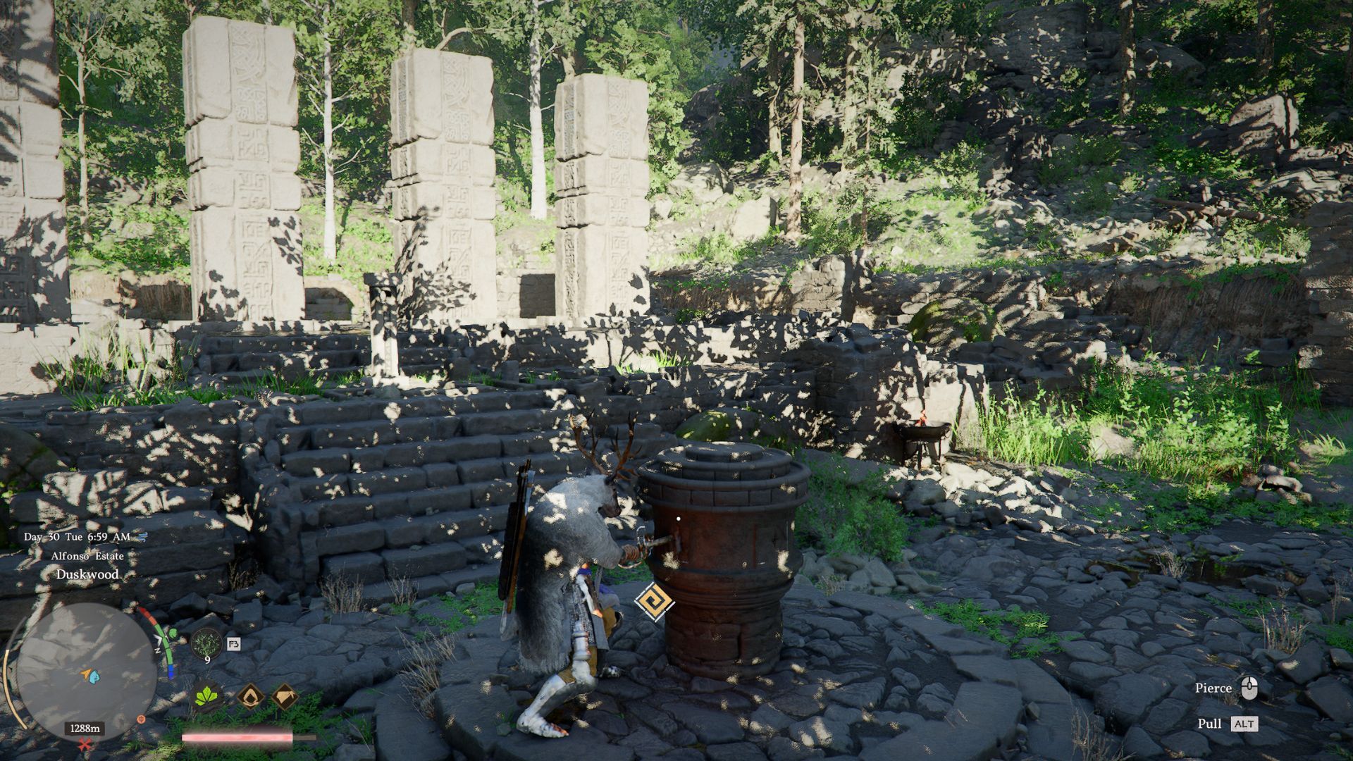 Когда вы прибудете к руинам Холма Сумрака, вы сразу же увидите, что они заросли лианами. Эти лианы скрывают пять столбов и центральный циферблат, расположенный перед ними.