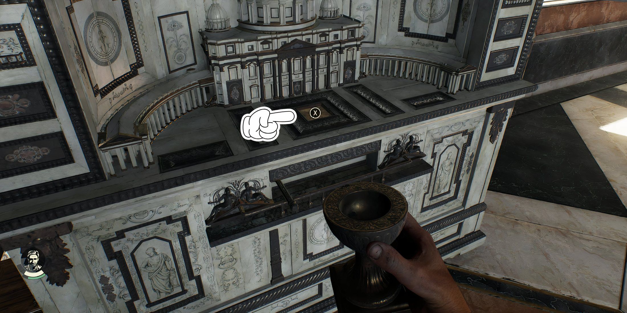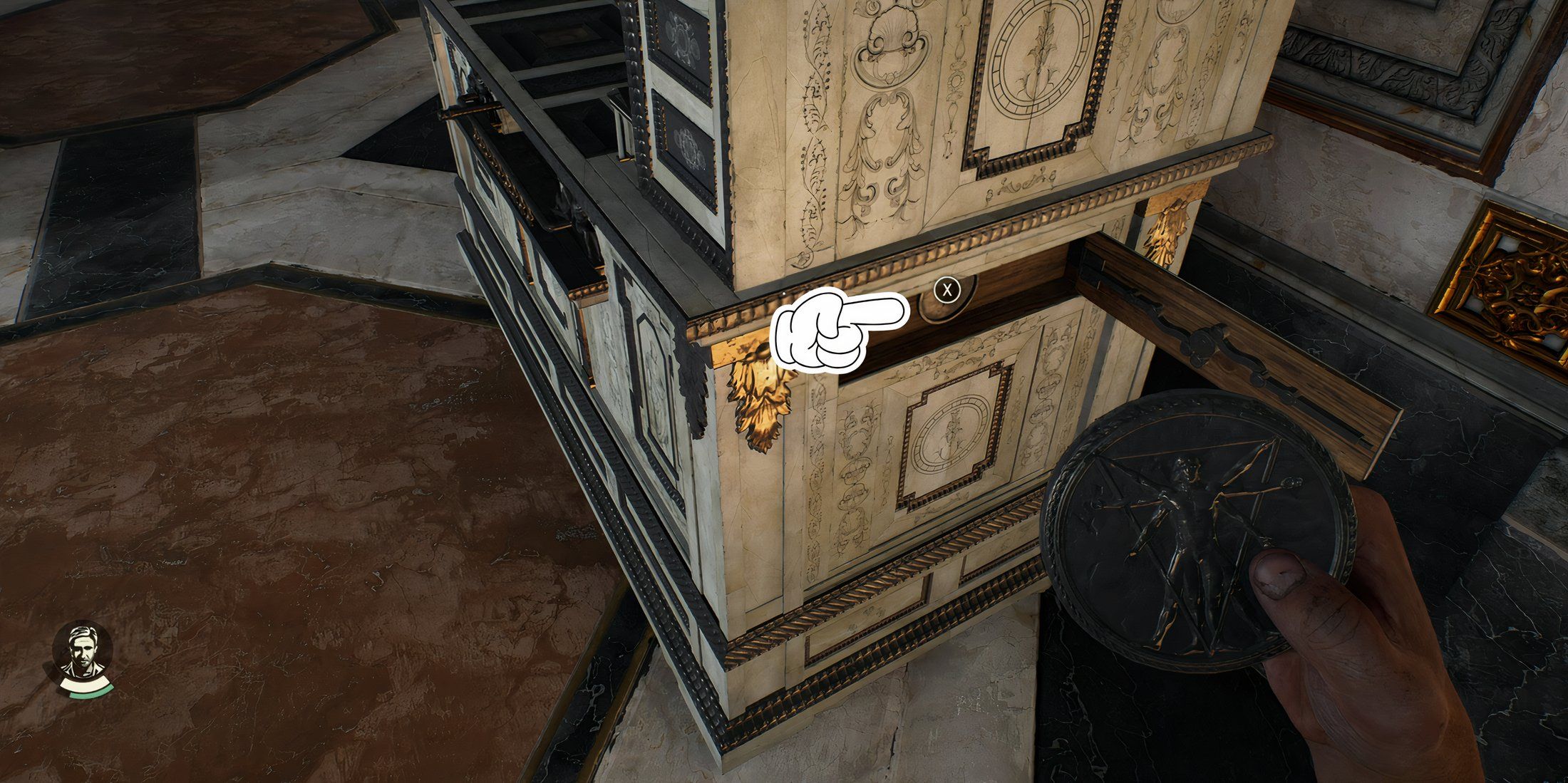 Первоначально игрокам необходимо нажать на рычаг и толкнуть его вправо. Выполнение этого действия откроет скрытый раздел в левой части окна «Головоломка Базилики». После открытия осмотрите левую область и возьмите Рельефный медальон, который хранится внутри.
