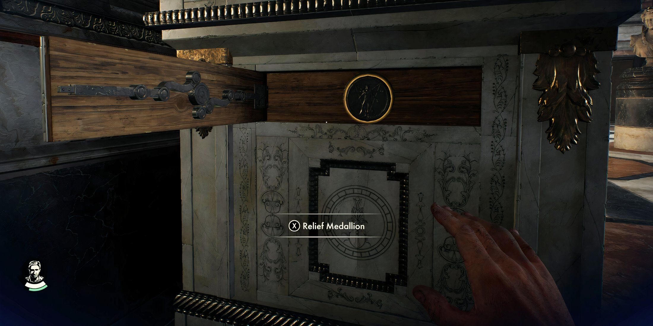 Первоначально игрокам необходимо нажать на рычаг и толкнуть его вправо. Выполнение этого действия откроет скрытый раздел в левой части окна «Головоломка Базилики». После открытия осмотрите левую область и возьмите Рельефный медальон, который хранится внутри.