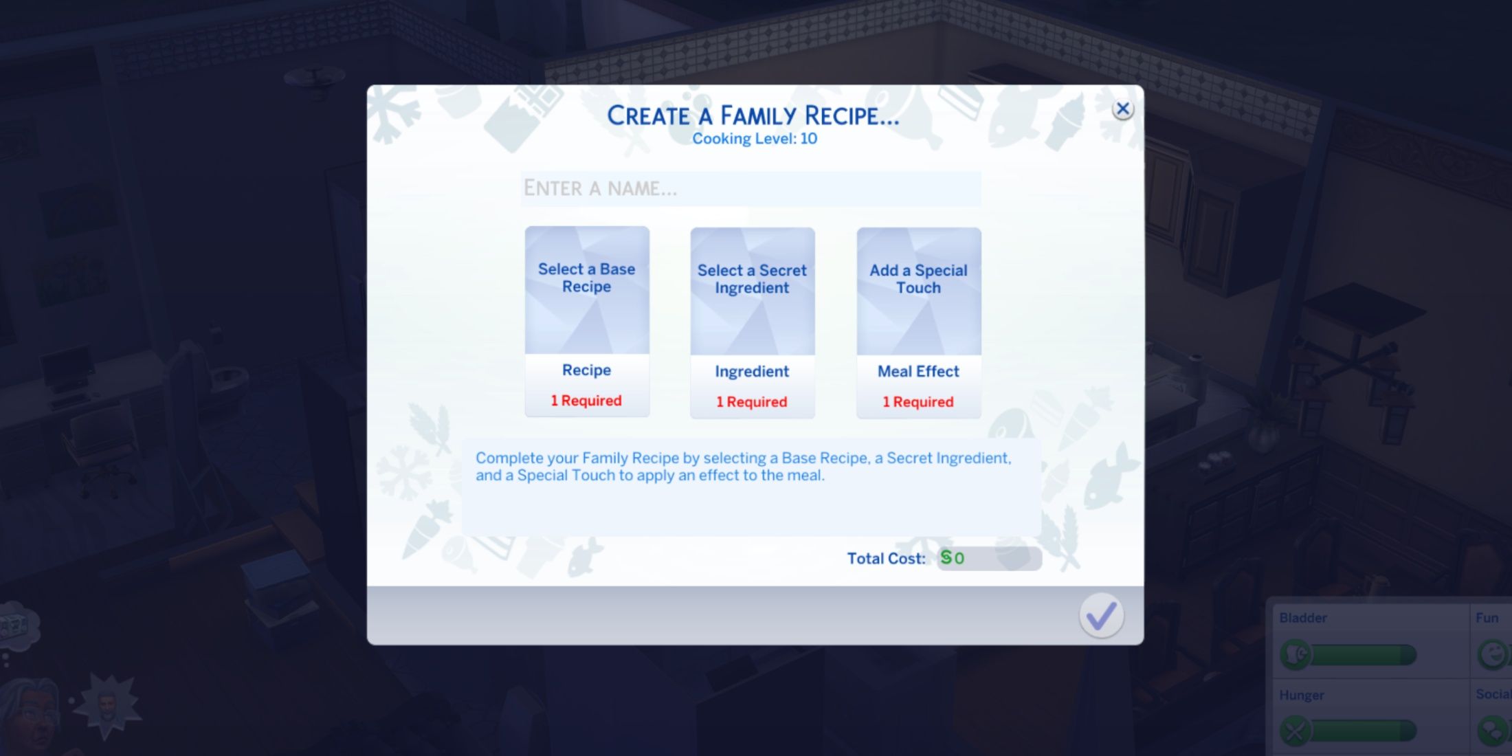 В игре The Sims 4 игроки должны взаимодействовать с холодильником или духовкой, открыть интерфейс Семейные Рецепты и нажать на «Создать новый семейный рецепт». Затем они должны выбрать начальный рецепт, эксклюзивный ингредиент и персональную добавку. После завершения этих шагов они могут его назвать и подтвердить. Этот процесс генерирует уникальный рецепт, который вызовет благоприятное воздействие на того, кто его потребляет, влияя на свойства блюда.