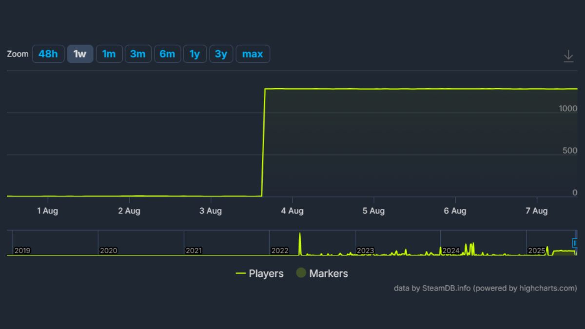С 31 июля по 3 августа максимальное количество одновременных игроков в этой игре достигло пяти, при этом всегда был как минимум один игрок. В субботу, 3 августа, игра внезапно подскочила до поразительных 1282 одновременных игроков. С того дня количество ни разу не опускалось ниже 1280, даже ни разу. График должен наглядно продемонстрировать эту тенденцию.