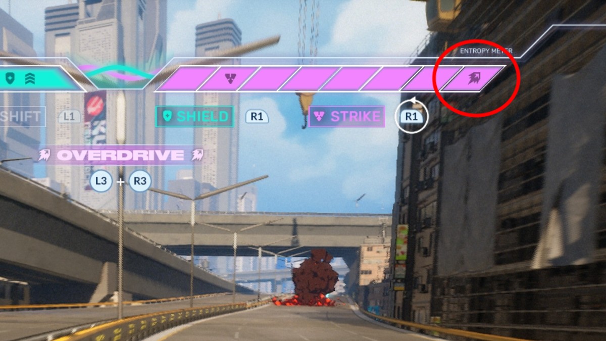 Когда вы активируете Overdrive, ваша машина получает постоянный импульс, пока активен Энтропийный метр. Столкновение с другими машинами во время Overdrive выведет их из строя, если они не используют свои щиты. Будьте осторожны, хотя! Overdrive делает вашу машину трудноуправляемой, и столкновение со стенами может выбить вас из гонки. Поэтому поворачивайте аккуратно, используя импульс!