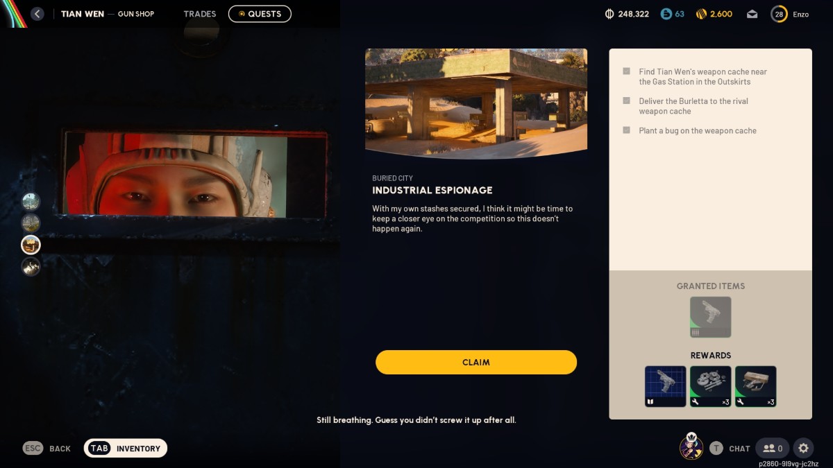 Как только вы начнете задание, Тянь Вэнь даст вам Burletta. Держите его при себе, но не полагайтесь на него в бою – вы потеряете его, когда завершите задание, поэтому используйте свое обычное оружие. Если вы случайно потеряете Burletta до завершения каких-либо целей, вы всегда можете купить еще один у Тянь Вэнь за 8 700 Credits.