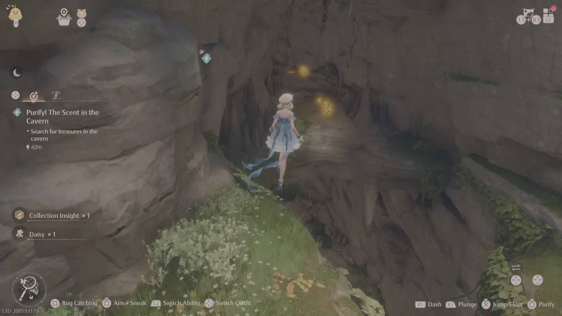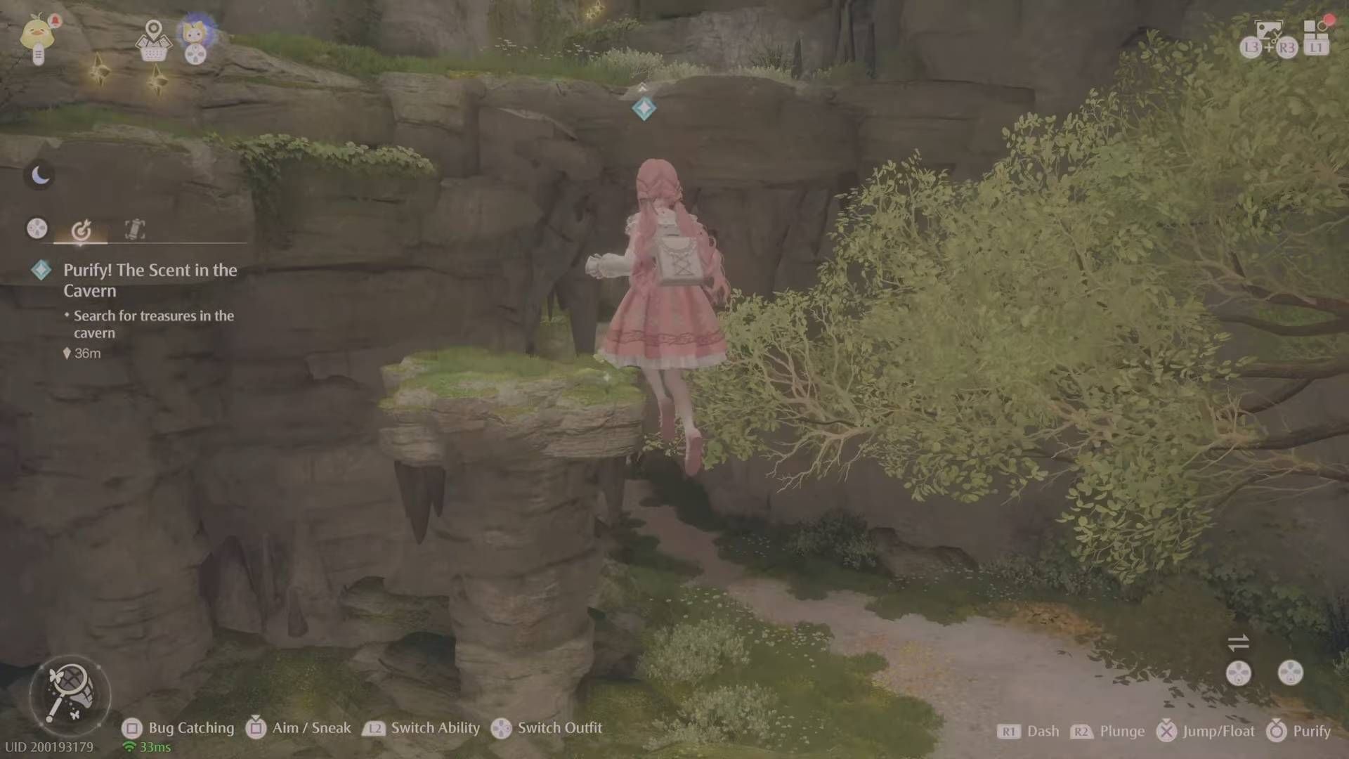 Впереди находится часть с платформами для прыжков и Эсселингами на полу внизу, так что прыгайте с платформы на платформу, чтобы собрать немного Bling. Затем спуститесь, чтобы разобраться с Эсселингами (так как их капли нам понадобятся позже), а также возьмите немного Росы Вдохновения. Продолжая идти по пещере, вы встретите место, куда можно подняться (рядом с бревном, на котором вы можете присесть).