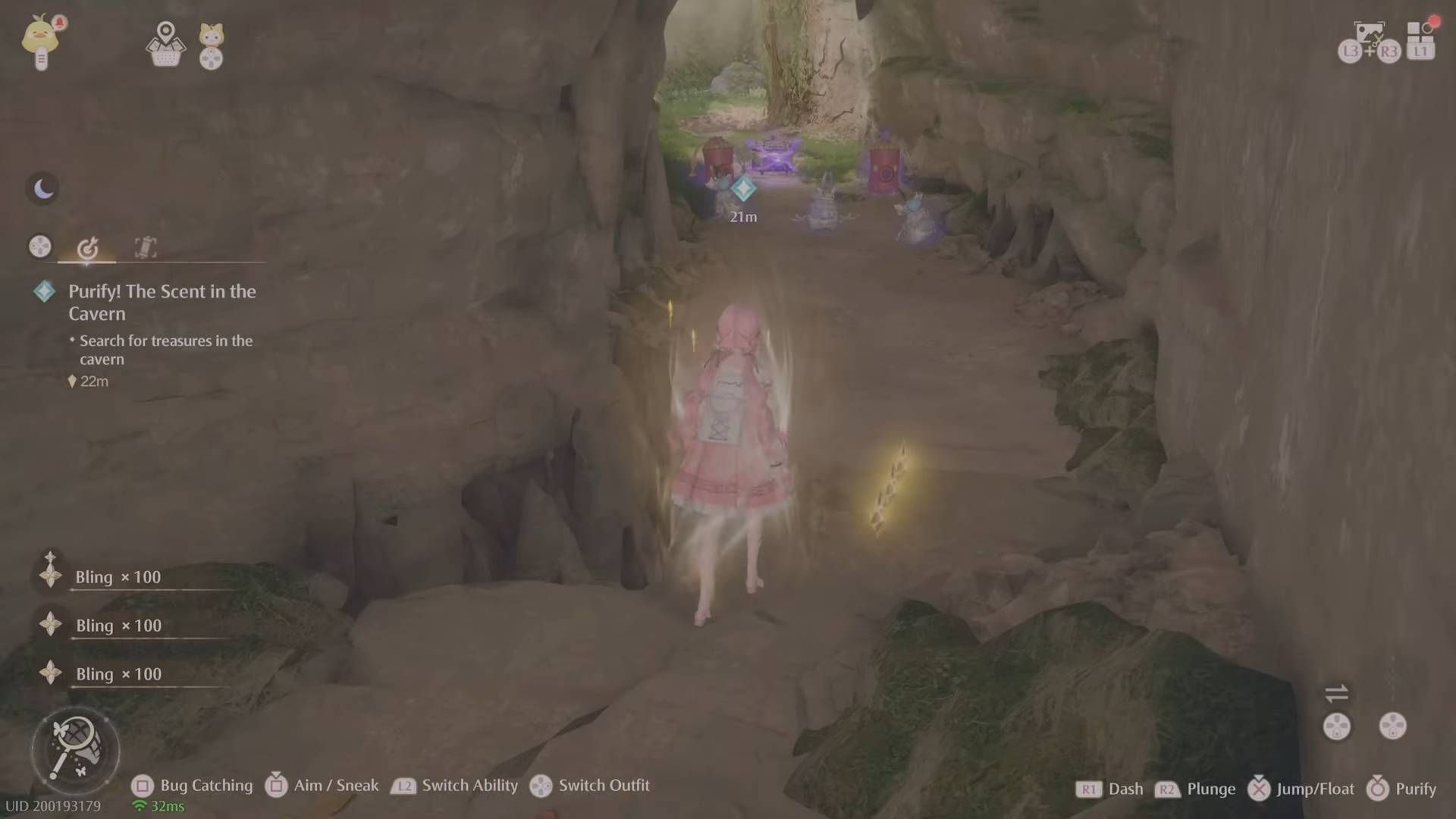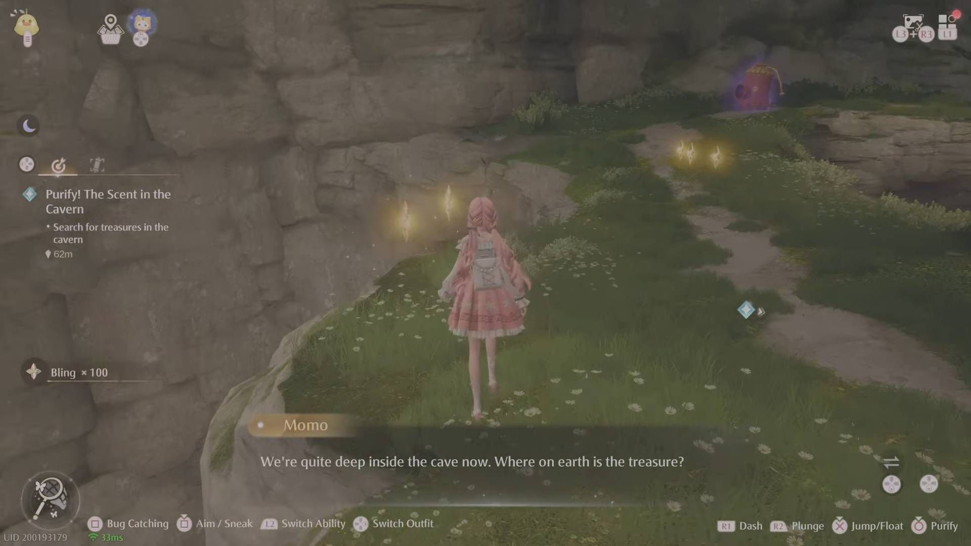 Впереди находится часть с платформами для прыжков и Эсселингами на полу внизу, так что прыгайте с платформы на платформу, чтобы собрать немного Bling. Затем спуститесь, чтобы разобраться с Эсселингами (так как их капли нам понадобятся позже), а также возьмите немного Росы Вдохновения. Продолжая идти по пещере, вы встретите место, куда можно подняться (рядом с бревном, на котором вы можете присесть).