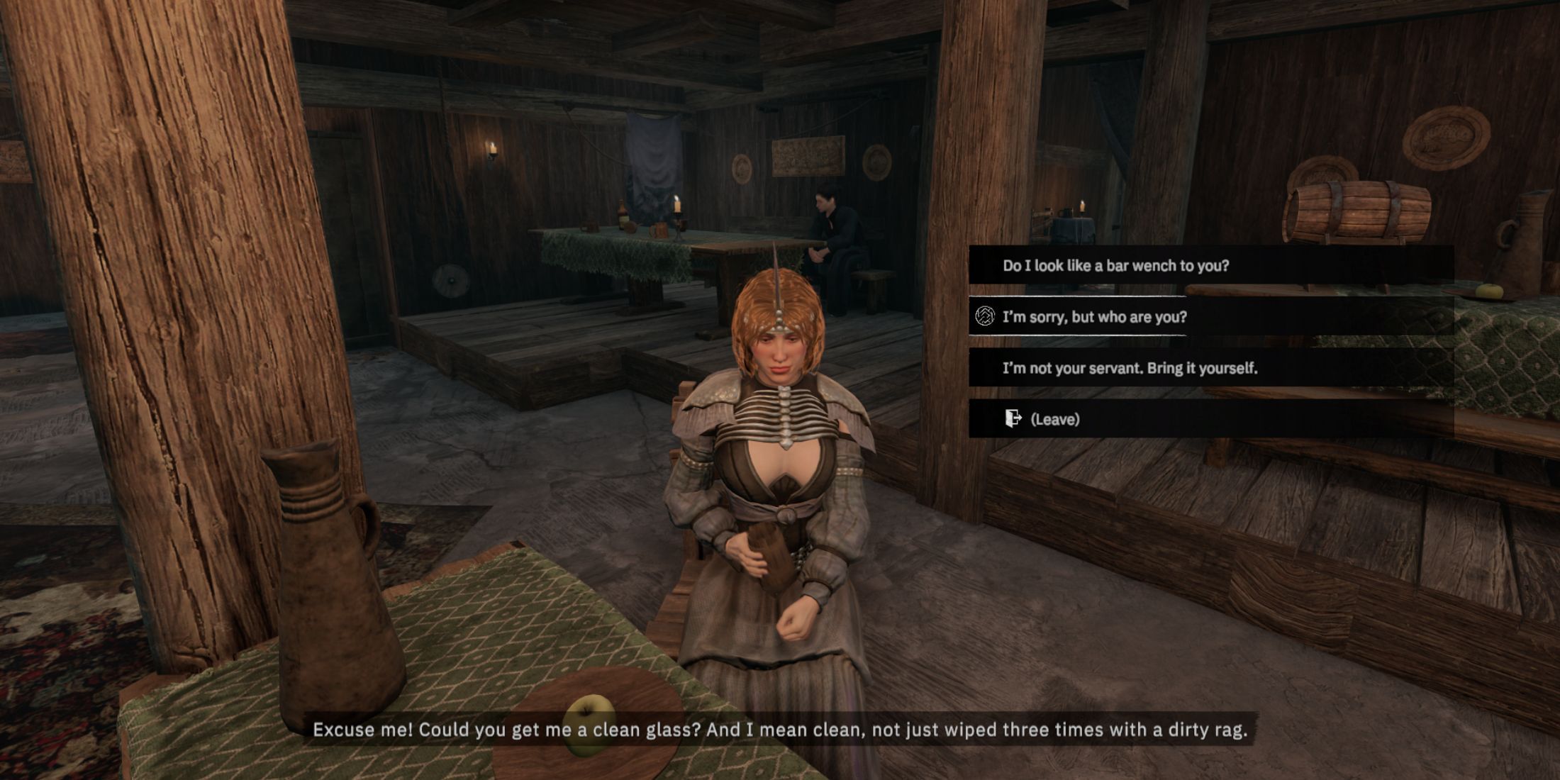 Когда вы общаетесь с Алисой, она может спутать вас за сервер и попросить свежий стакан воды. В процессе беседы она хвастается тем, что является весьма уважаемой придворной дамой в Камелоте. Если похвалить ее наряд, она расскажет, что стремится соответствовать моде жителей Юга. Продолжайте разговор, скажите ей несколько теплых слов, и в какой-то момент она сообщит, что нуждается в помощи с одним заданием.