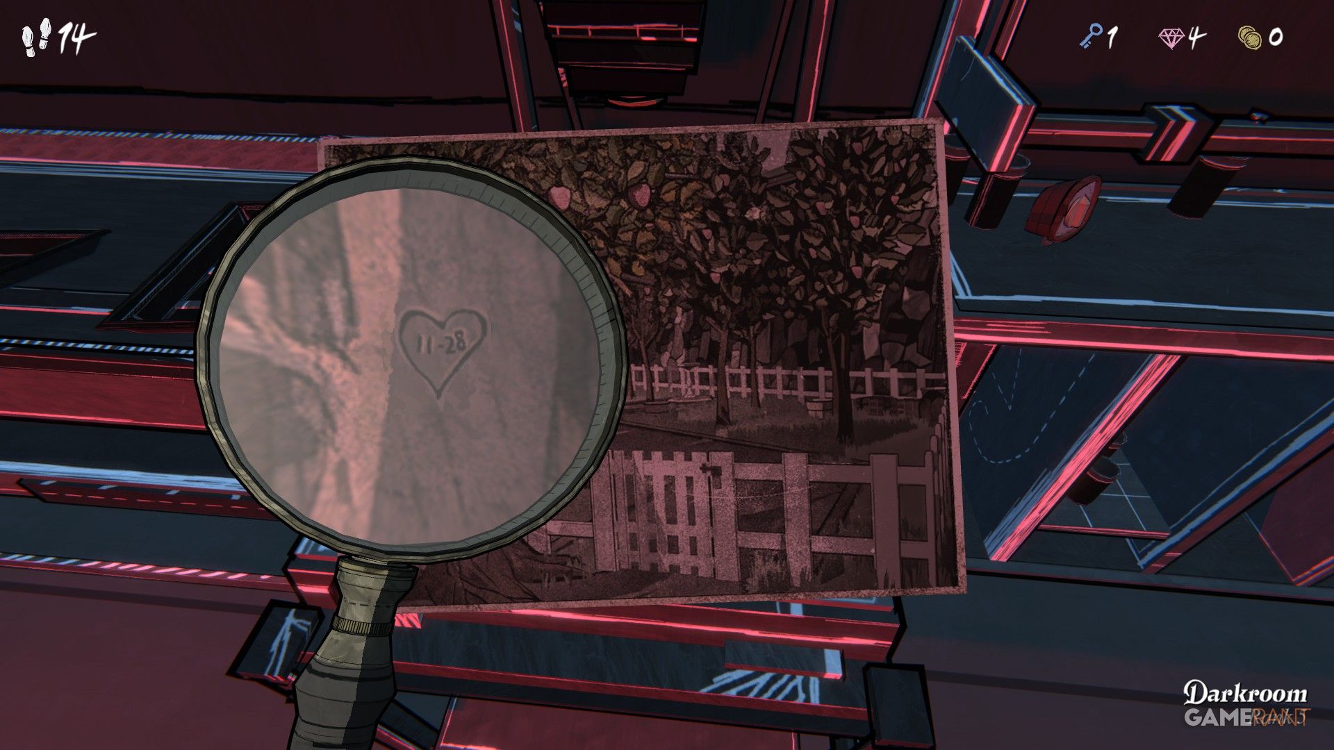 Обычно Темная Комната полностью лишена света. Однако при активации выключателя в Утилитарной Комнате свет включится. Если у вас еще нет Лупы, найдите ее внутри здания. Пока вы находитесь в Темной Комнате, ищите картину с изображением Яблоневого Сада. Расположите Лупу над ней и увеличьте изображение большого дерева слева. На сердцевом вырезе на дереве вы обнаружите дату 28 ноября (11/28). Это код, необходимый для открытия ворот, которые держат вас за пределами Яблоневого Сада, помогая решить эту головоломку.
