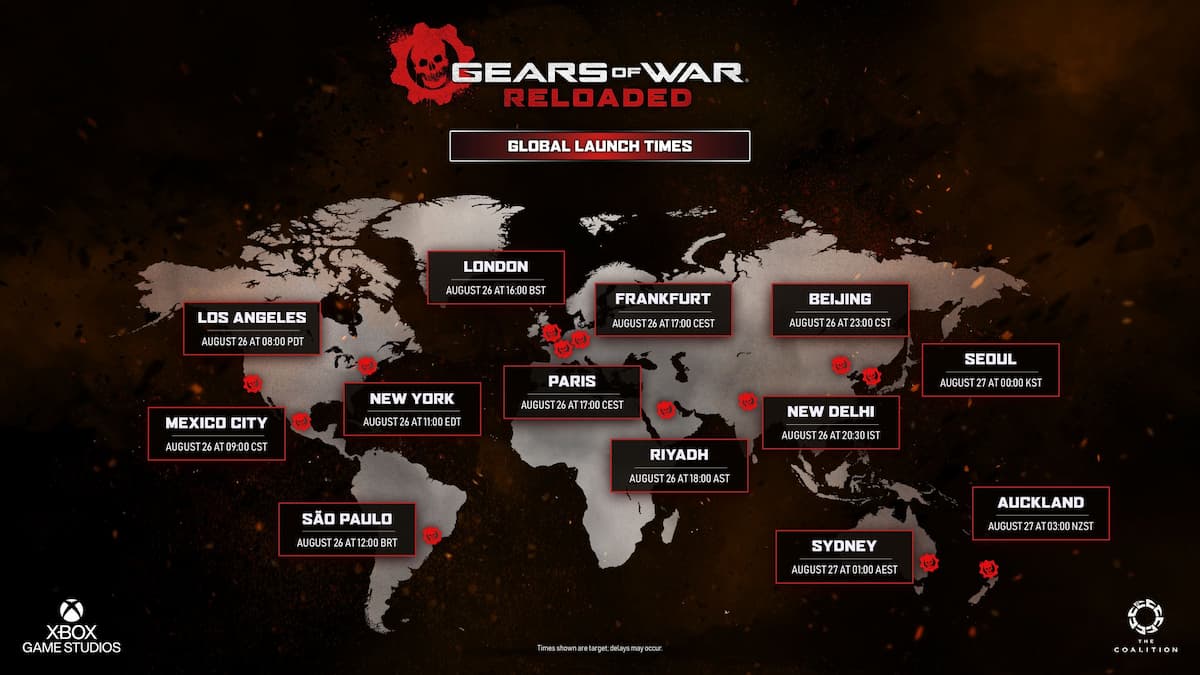 Посмотрите на эти расписания! Они сообщают, когда Gears of War: Reloaded станет доступен для загрузки, содержат информацию о предварительной загрузке и точное время, когда вы сможете начать играть, в зависимости от вашего местоположения.