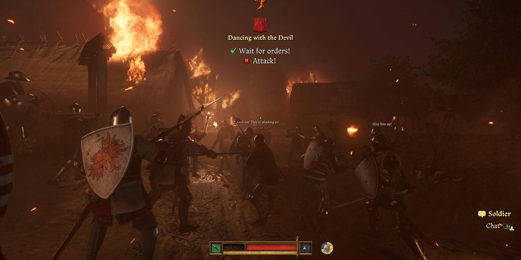 После нашего разговора о планах мы перейдем к вечеру, и следующая сцена, демонстрирующая группу, стоящую возле укреплений Малешова. Неожиданно, сухой дьявол подтолкнет к поджогу в деревню, что не упоминалось ранее, что потенциально подвергая опасности невинных жителей.