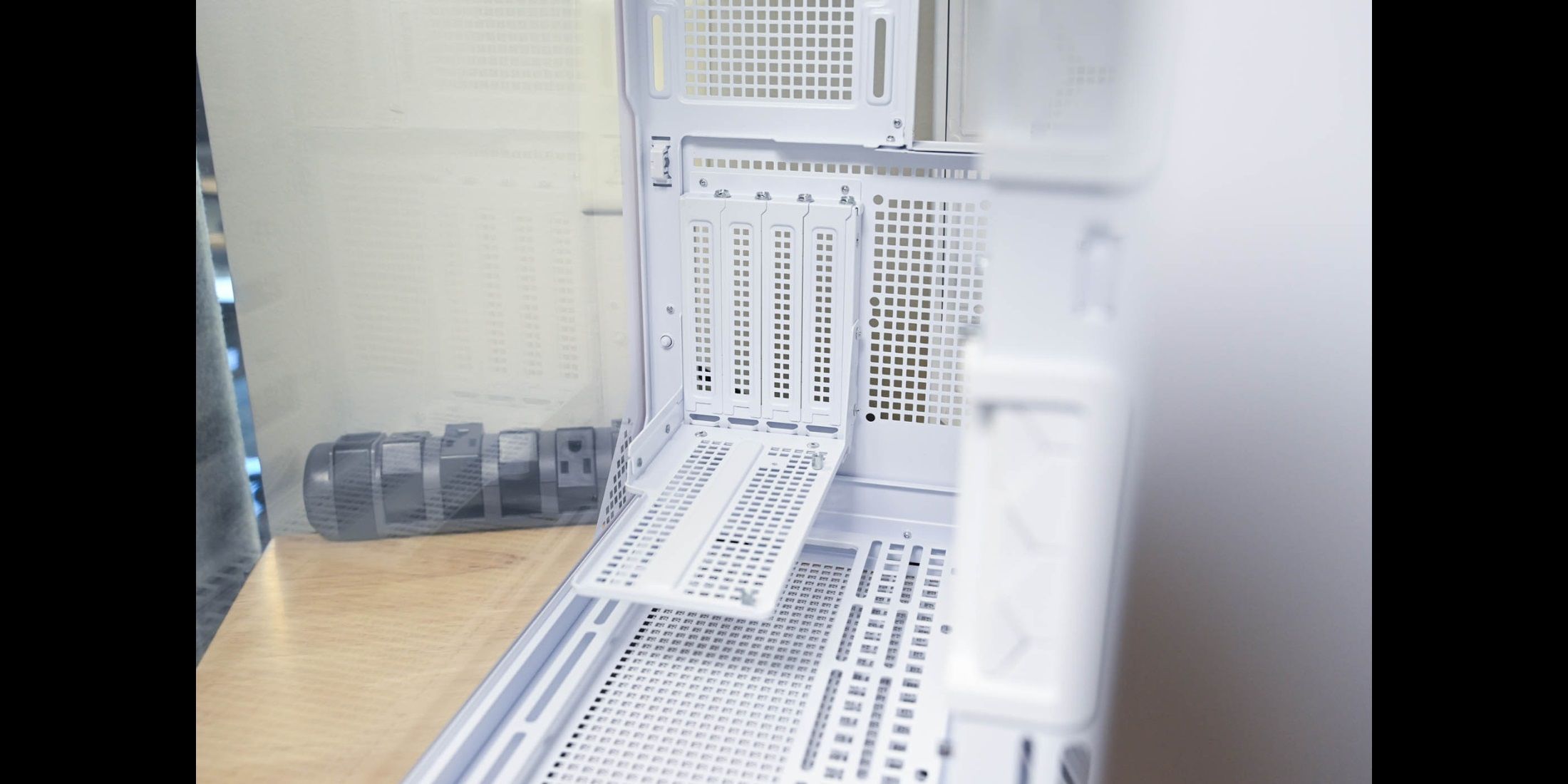 Еще одно ключевое преимущество этого корпуса — просторное пространство за правой боковой панелью. Блоки питания расположены на возвышении в правом верхнем углу, что позволяет аккуратно спрятать кабели. Если сборщик выберет материнскую плату с задним подключением или Project Zero, можно легко добиться более обтекаемого внешнего вида. Две раздвижные дверцы позволяют разместить твердотельные накопители, жесткие диски, вентиляторы/концентраторы RGB или даже закрепить их винтом с накатанной головкой. Для дополнительной гибкости предусмотрено место для установки твердотельных накопителей внизу корпуса или рядом с передней панелью.