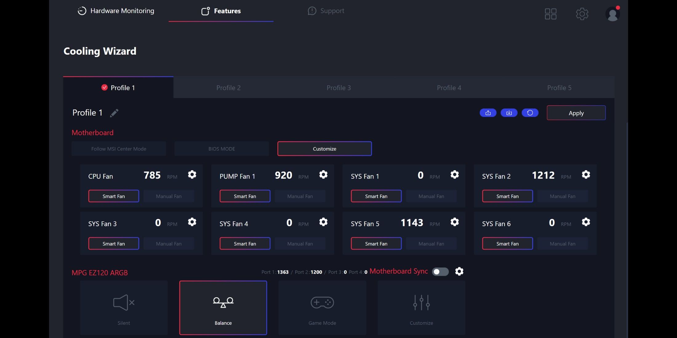 Как давний энтузиаст ПК, много лет собирающий и настраивающий свои собственные системы, я могу с уверенностью сказать, что вентиляторы MPG EZ120 немного шумны из коробки, особенно когда все десять вентиляторов плюс вентилятор насоса AIO работают одновременно. Однако этого следует ожидать в высокопроизводительных системах охлаждения, подобных этой. Предложение производителя использовать программное обеспечение MSI Center для управления штабелируемыми вентиляторами имеет смысл, учитывая мой собственный опыт работы с подобным программным обеспечением в прошлом.