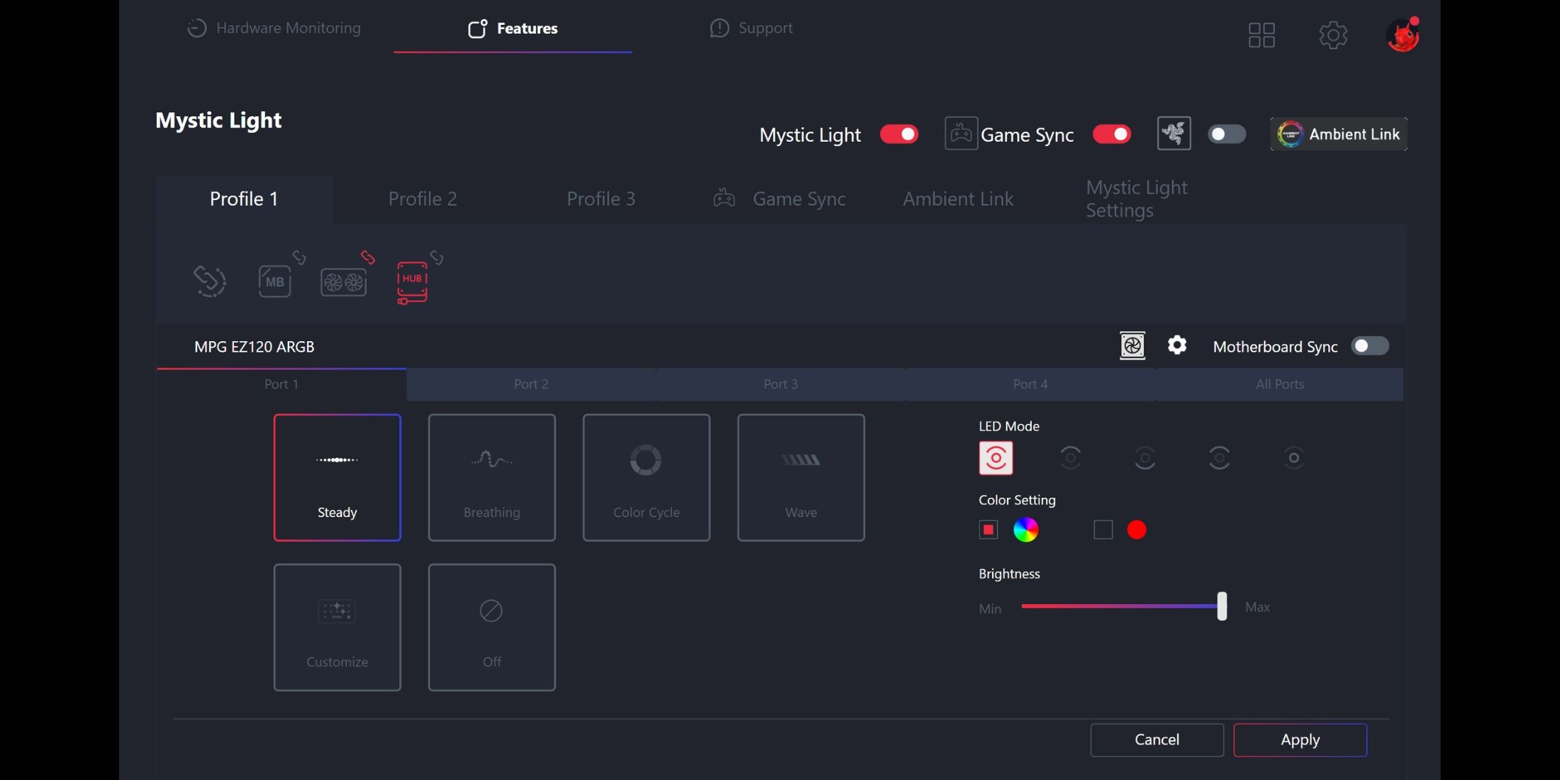 Как поклонник вентиляторов MSI MPG EZ120, я ценю дополнительное преимущество персонализации подсветки каждого вентилятора через MSI Center. Так же, как и регулировка скорости вращения вентилятора, пользователи могут настроить эффекты ARGB для каждого порта концентратора с помощью Mystic Light. Кроме того, благодаря возможностям программного обеспечения геймеры могут синхронизировать освещение всей своей установки с RGB-клавиатурами, мышами и интеллектуальными лампами, совместимыми с Razer Chroma.