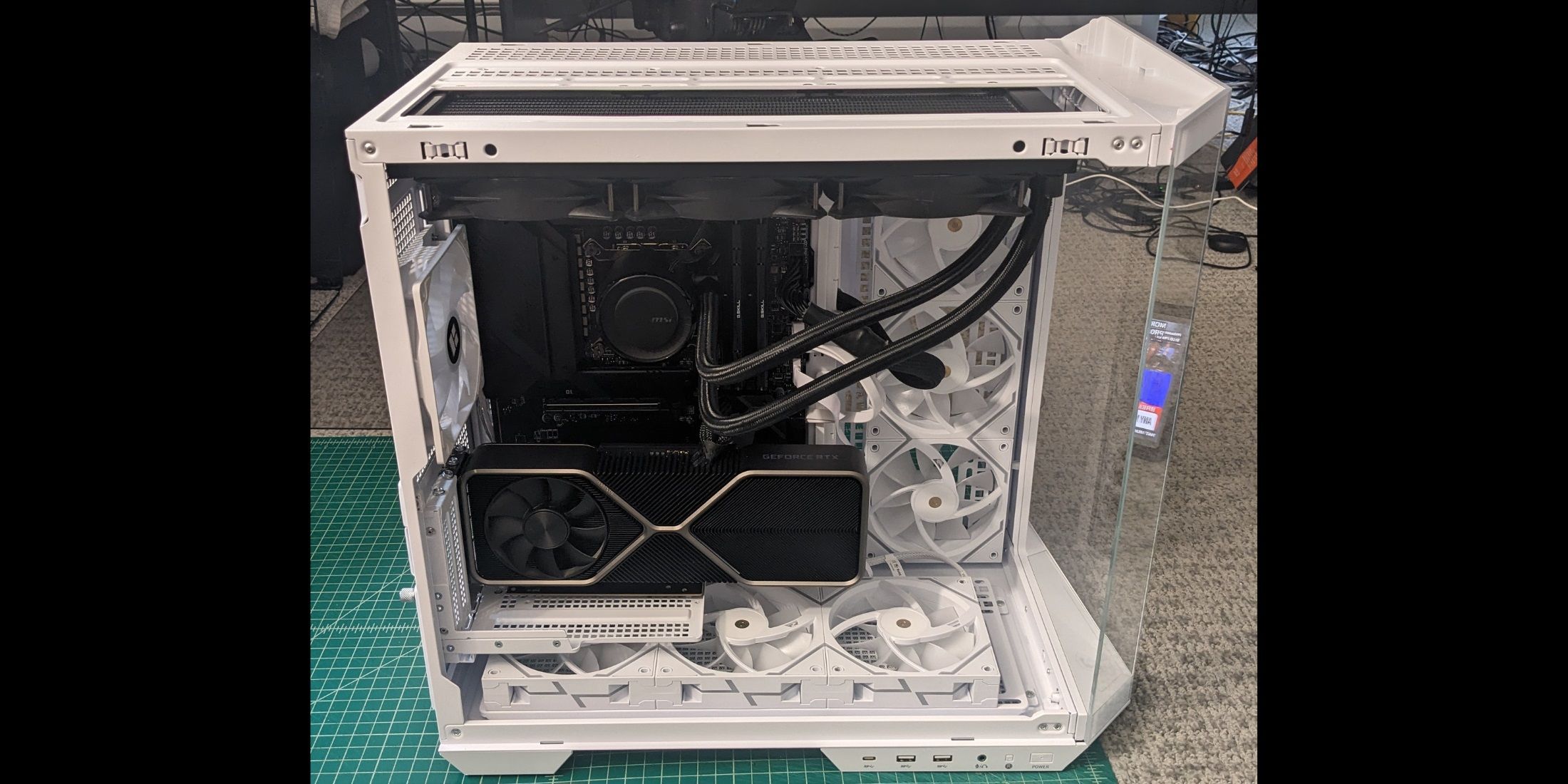 Чтобы завершить строительство, NVIDIA RTX 3080 была установлена на стандартной вертикальной подставке для графического процессора. Даже при установке как можно ближе к материнской плате предусмотренный кронштейн держателя графического процессора не был достаточно выдвинут, чтобы обеспечить значительную поддержку видеокарты. Карты большего размера, вероятно, получат большую стабильность от этого аксессуара.