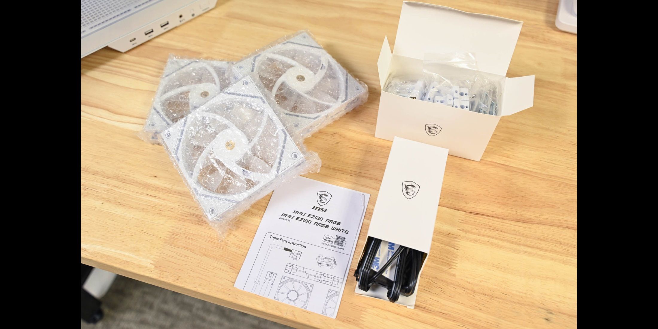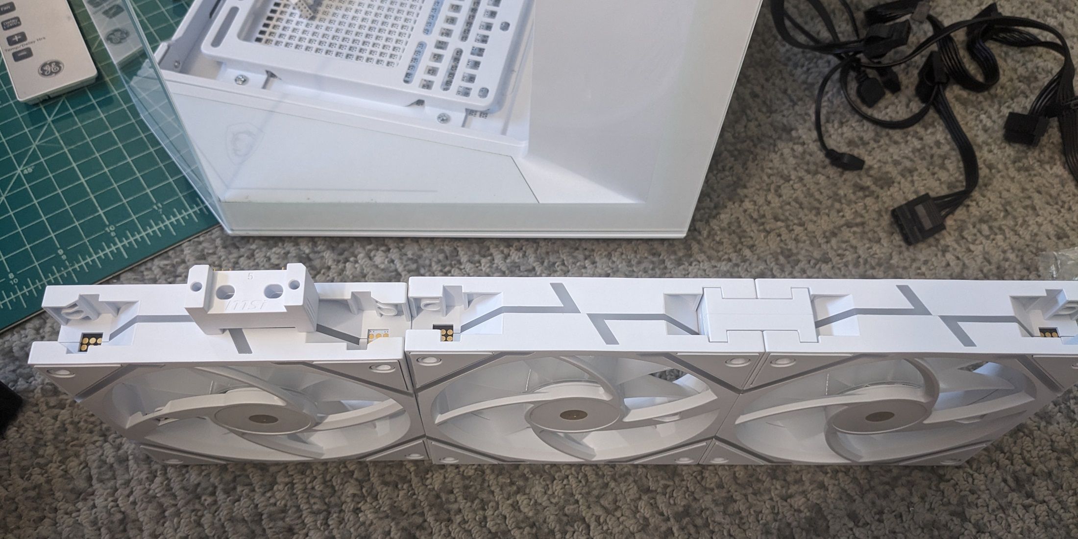 Поскольку в корпусе нет встроенных вентиляторов, для облегчения сборки в дальнейшем целесообразно установить дополнительные вентиляторы. Вентиляторы MPG EZ120 ARGB предназначены для штабелирования, но их также можно разделить, если тщательно проложить проводку. Как и следовало ожидать, учитывая высокую стоимость, эти вентиляторы имеют прочную и долговечную конструкцию, способную выдержать случайные падения или царапины во время установки.