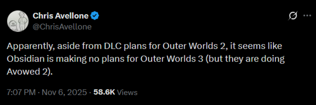 Бесплатный телеграм-каналУ него всё ещё есть связи с Obsidian, и недавно он раскрыл некоторую информацию. Он говорит, что планируется Avowed 2, но в настоящее время нет обсуждений о создании третьей Outer Worlds игры, помимо запланированного DLC.