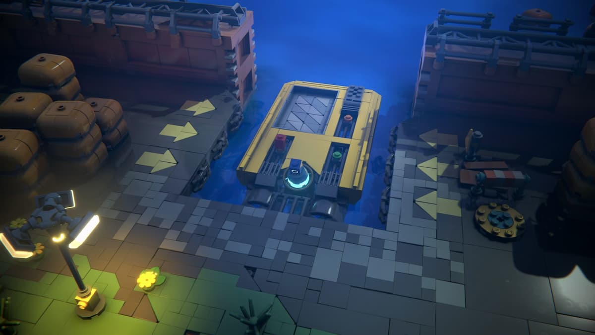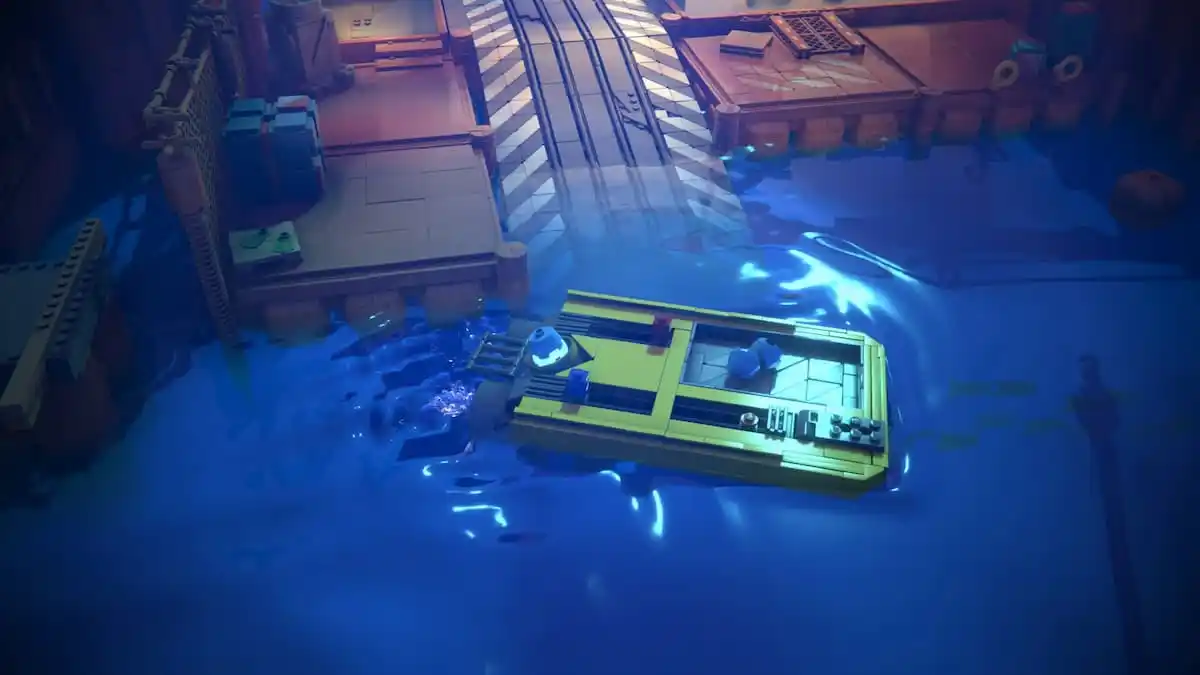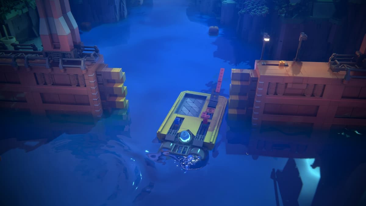 После получения усиления и нескольких кирпичей, двигайтесь вперед, придерживаясь левой стороны, чтобы добраться до новой платформы. Используйте небольшой кирпич, чтобы стабилизировать желтую платформу, а оставшиеся кирпичи используйте для строительства пути к левой платформе. Соберите там кирпич усиления, затем прыгните на движущуюся серую платформу, чтобы вернуться к лодке.