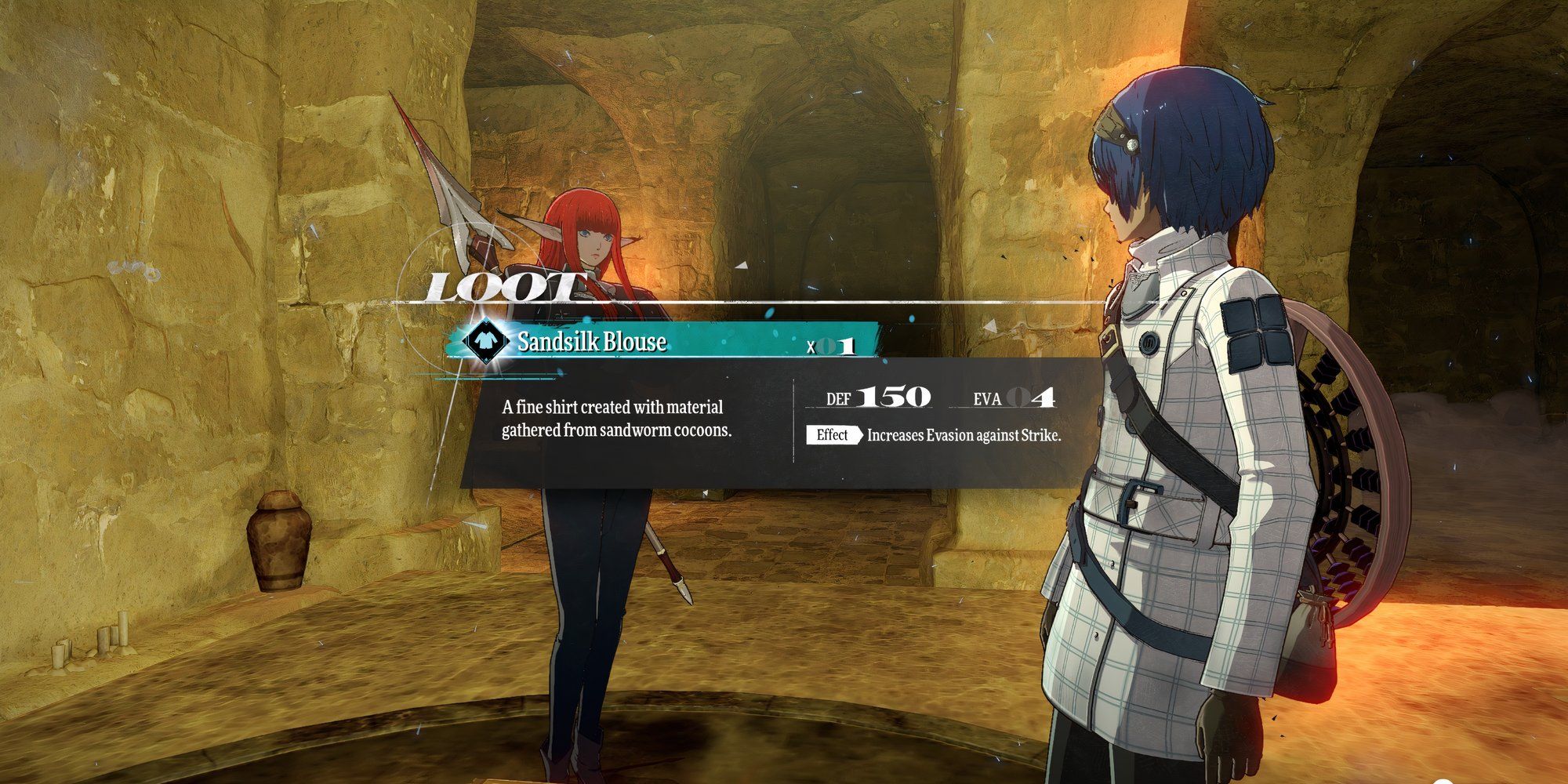 Шелковая блузка из песчаного шелка спрятана в Забытом мавзолее, месте, куда можно добраться, выполнив побочную миссию. Игроки могут начать цепочку квестов «Кинжал, кольцо и мотыга» в игре Metaphor: ReFantazio после разговора с Кукулусом в Мартире. Важно отметить, что Кукулус — вымышленное имя; он раскрывает свою истинную личность как Алонзо, когда игроки находят для него кольцо в лабиринте.