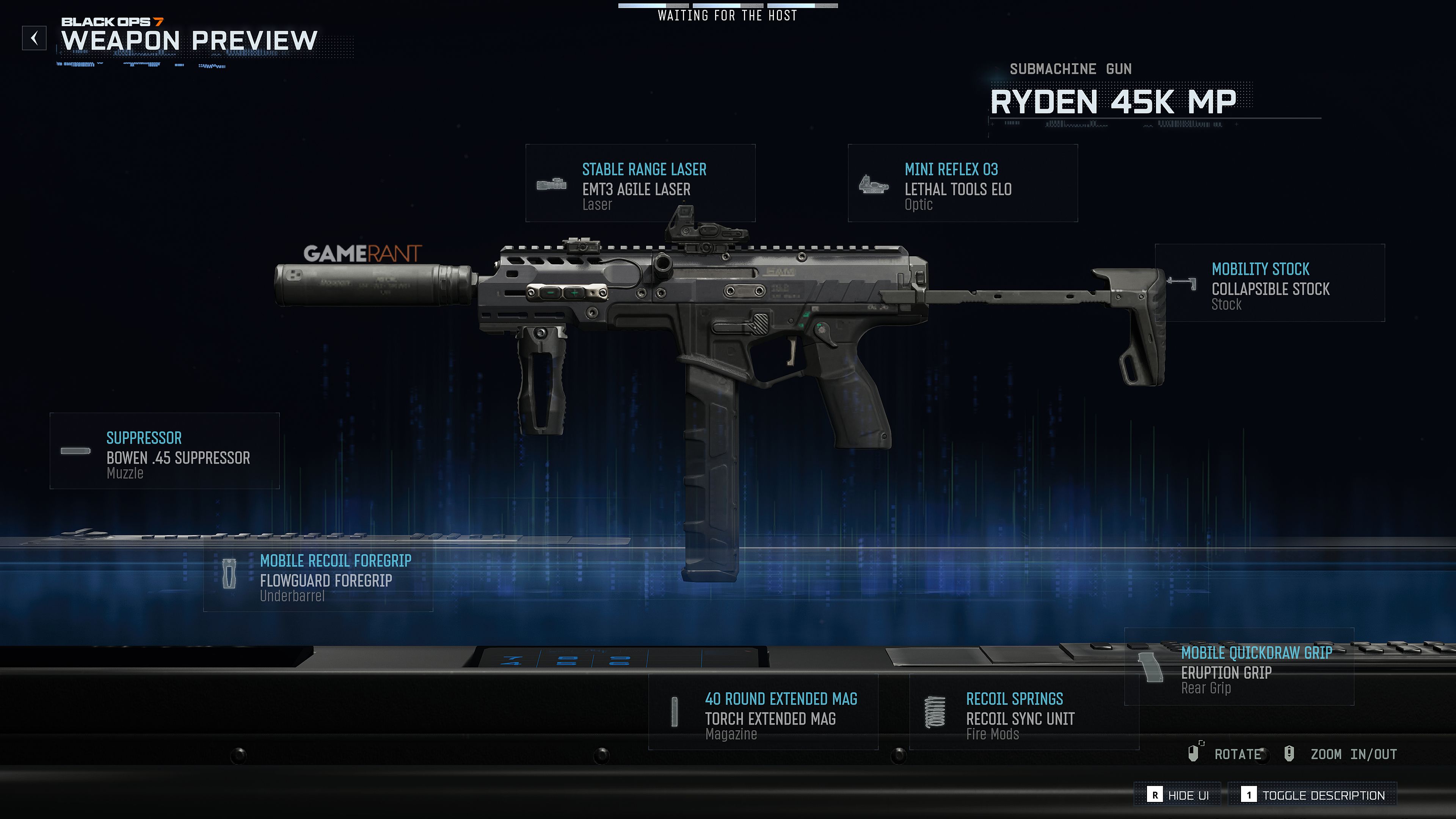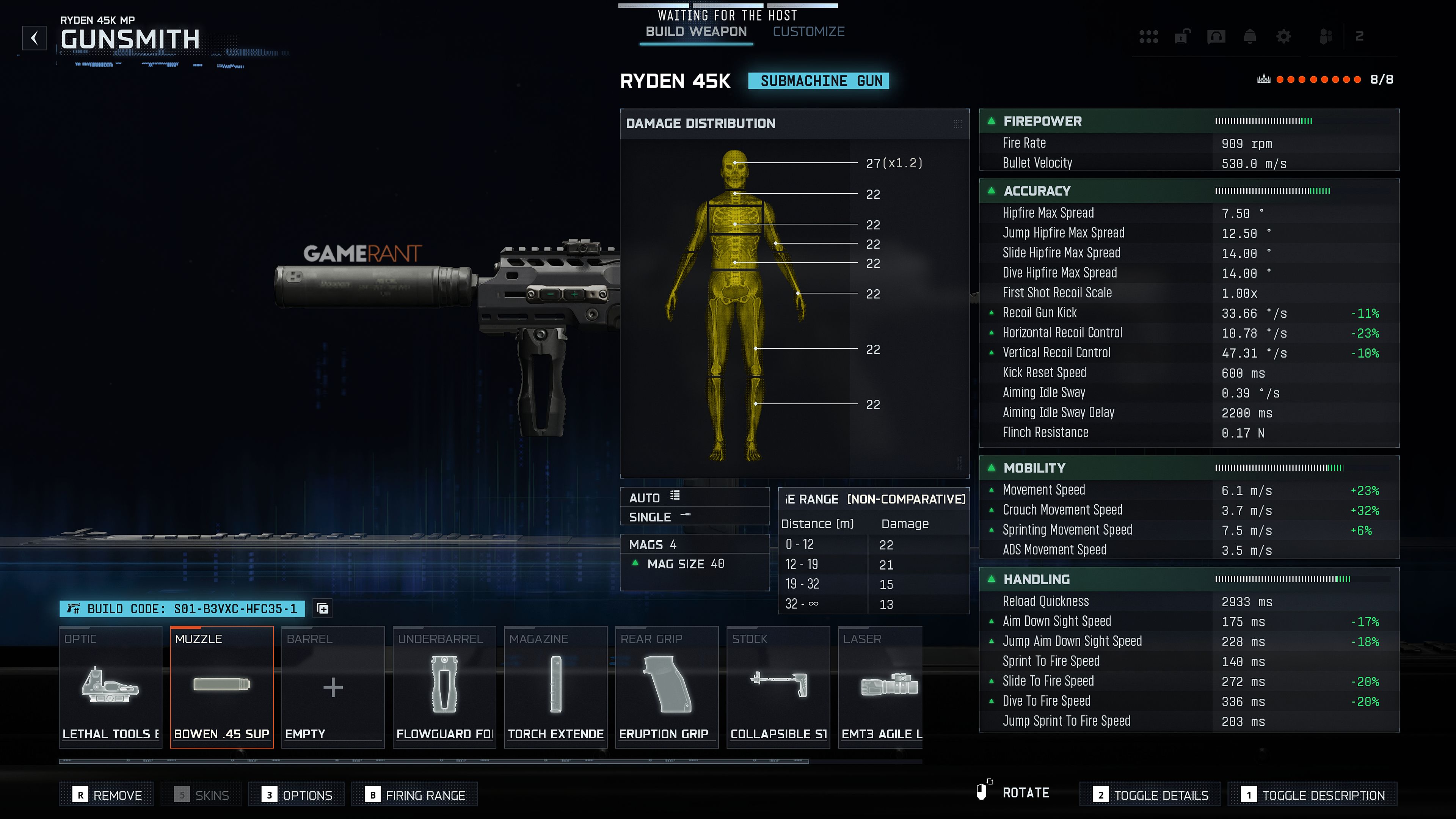 Ryden 45K быстр и отзывчив, но имеет некоторую отдачу – при непрерывной стрельбе он слегка подпрыгивает и дрожит из стороны в сторону. Игрокам потребуется попрактиковаться в контроле этих движений. Хотя полностью устранить колебания из стороны в сторону невозможно, правильные DLC могут помочь сделать его более удобным в обращении. Ознакомьтесь с рекомендуемыми DLC ниже.