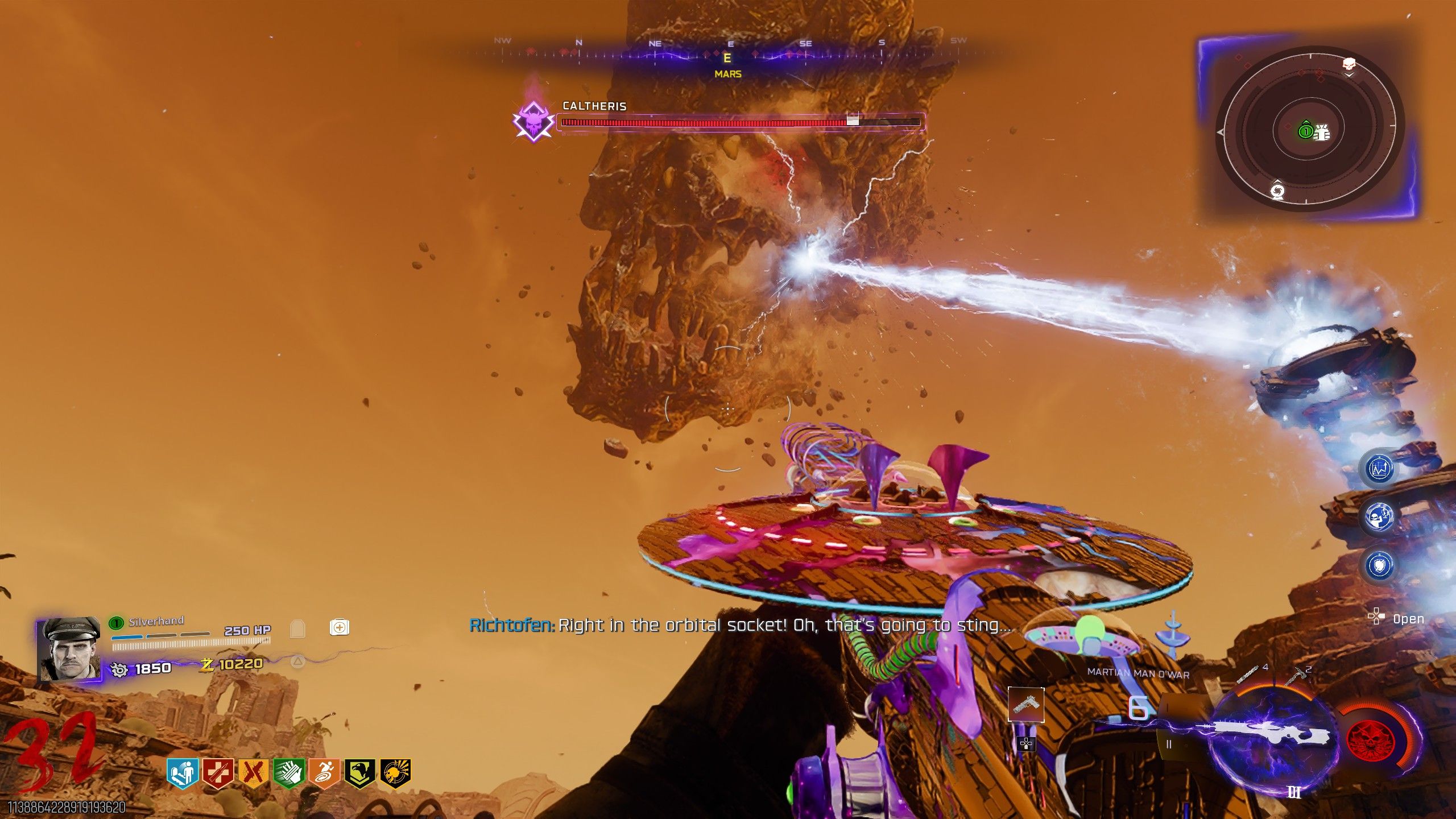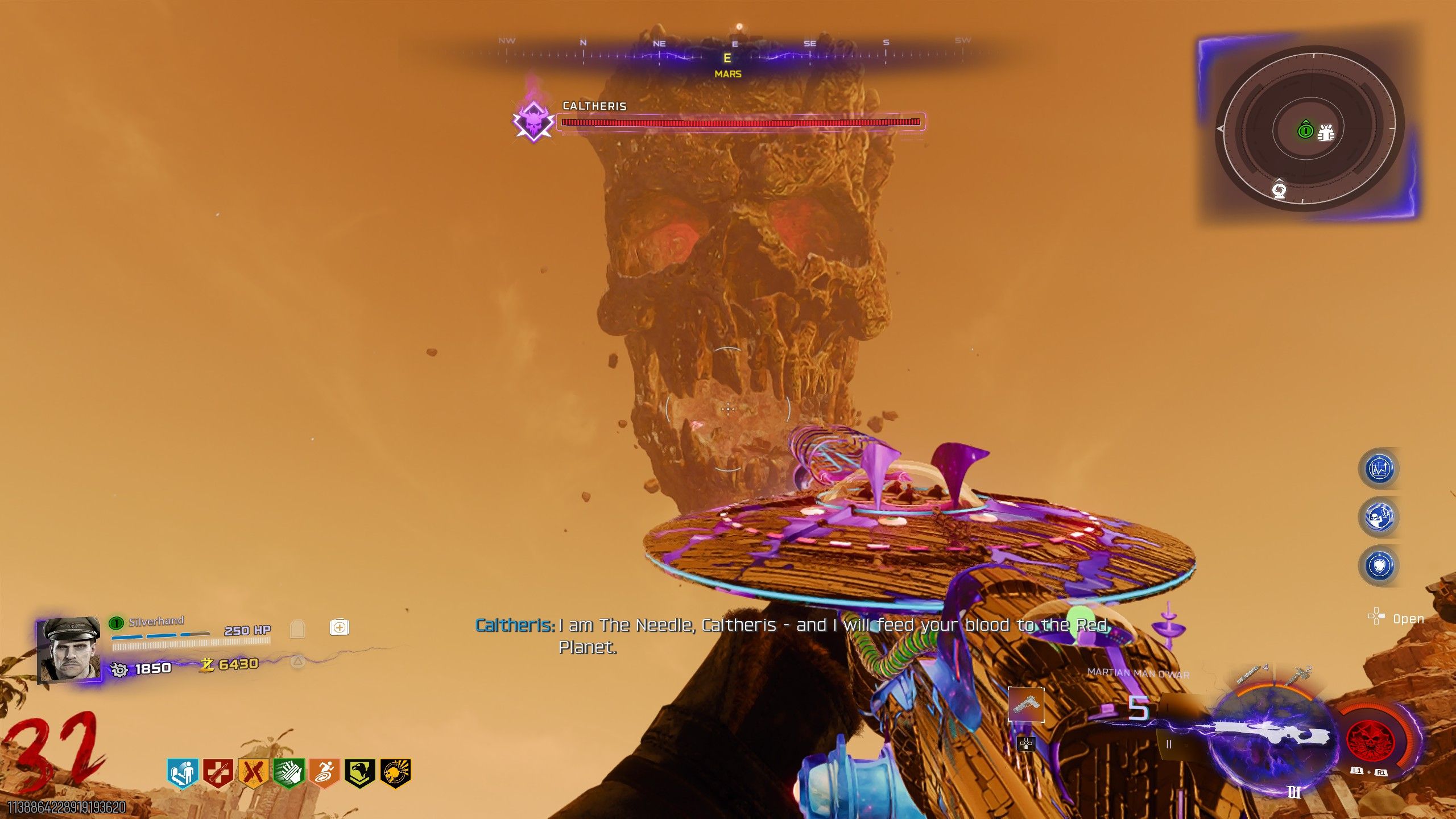 Первая часть сражения происходит с Caltheris – массивным, парящим черепом – который служит полем битвы. Ваше оружие не повредит Caltheris напрямую, поэтому вам нужно будет уклоняться от его лазеров и побеждать зомби. Убийство зомби наполняет генераторы энергией. Как только генератор заполнится, активируйте мозг на алтаре, чтобы начать последовательность стрельбы. Вам нужно будет повторить этот процесс три раза. Финальная последовательность требует, чтобы оба столба были запитаны.