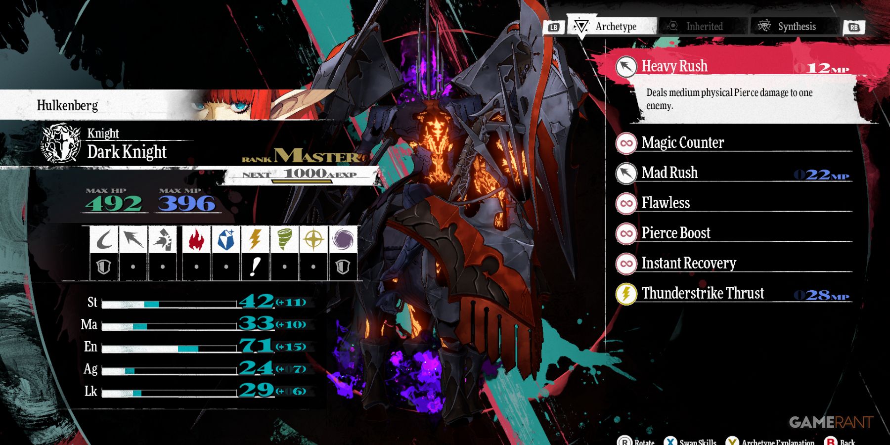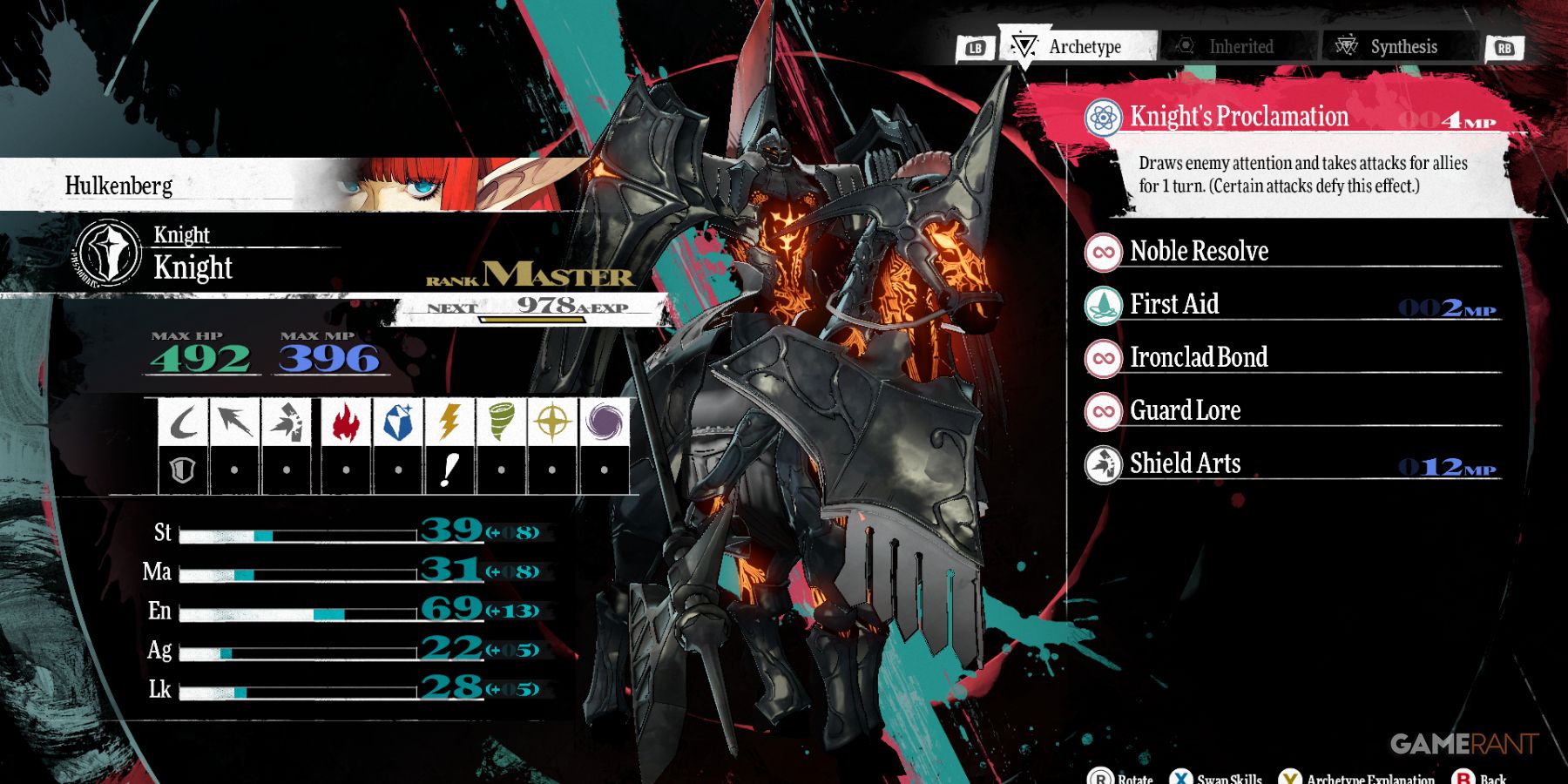 Базовый класс Хюлькенберга не выдерживает долго сложных задач, поставленных ReFantazio. В таких случаях рекомендуется перейти на Магического Рыцаря, поскольку это один из лучших вариантов для этого персонажа из-за его сильных характеристик. Несмотря на то, что защита продолжает оставаться приоритетом, включение магии добавляет желанную степень адаптивности.