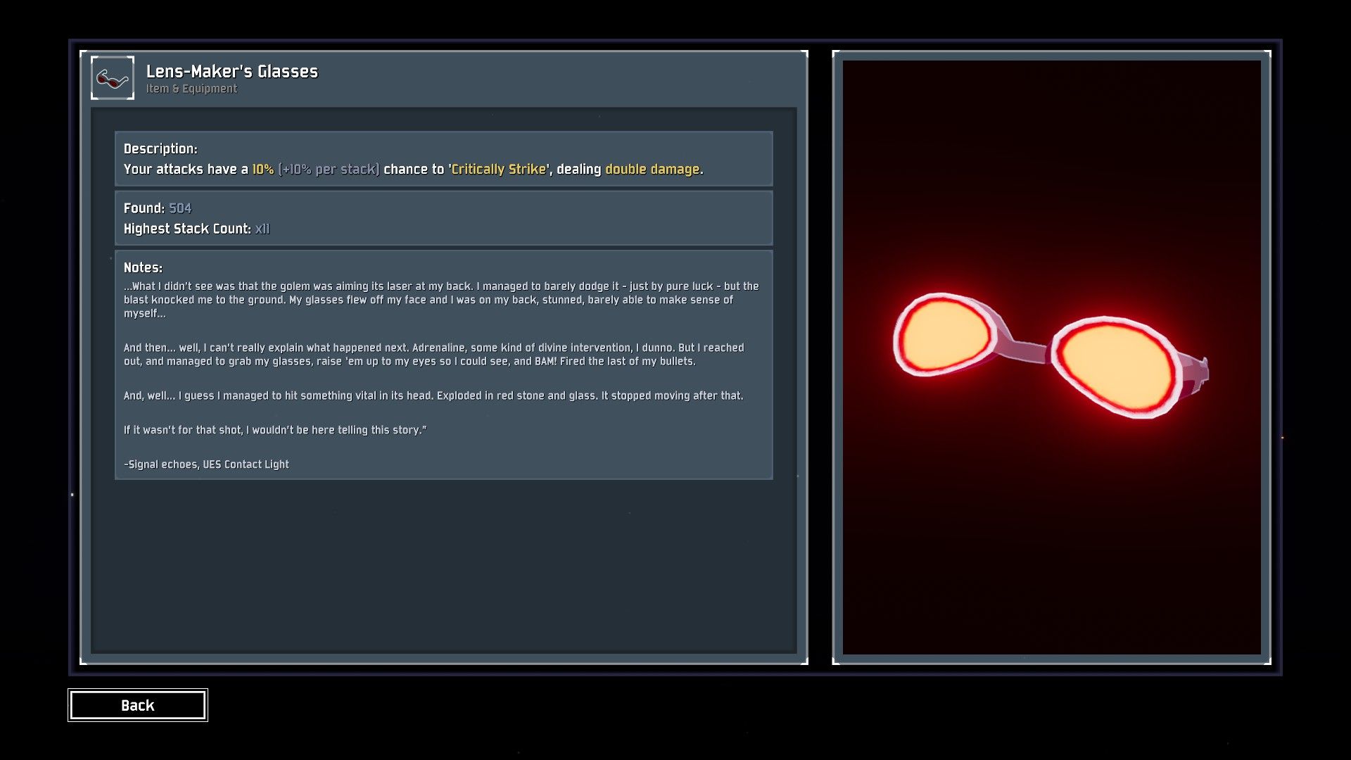 Среди всех белых предметов в игре, наносящих урон, Очки Линзмейкера выделяются как одни из самых полезных для большинства персонажей (за исключением Акрида). Этот предмет удваивает урон, наносимый прямыми атаками пользователя при активации, что делает его невероятно мощным. Кроме того, на критические удары в ROR 2 не влияют коэффициенты срабатывания, а это означает, что как только игроки приобретут 10 частей этого предмета, их атаки всегда будут критическими.