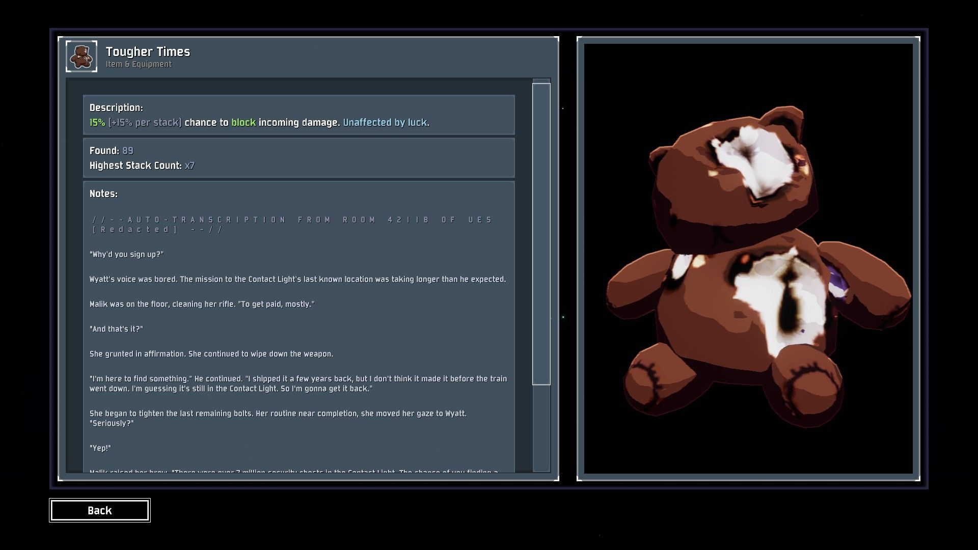 Проще говоря, наличие нескольких предметов Tougher Times увеличивает вероятность блокировки атак, но каждый дополнительный предмет дает меньшее увеличение. Однако даже если у вас много плюшевых мишек, они никогда не гарантируют игрокам 100% вероятность блока.