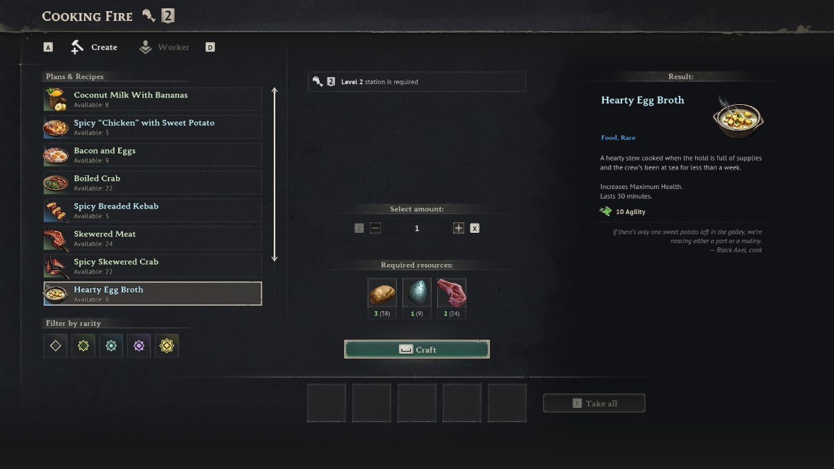 Хотя здоровье (Vitality) полезно, большинство усилений от еды повышают один из ваших основных параметров наряду с Vitality. Если вы не постоянно готовите еду из надёжного источника, лучше всего сосредоточиться на продуктах, которые дают вам комбинацию вашего основного параметра и выносливости, а затем использовать более простые рецепты для восполнения здоровья.