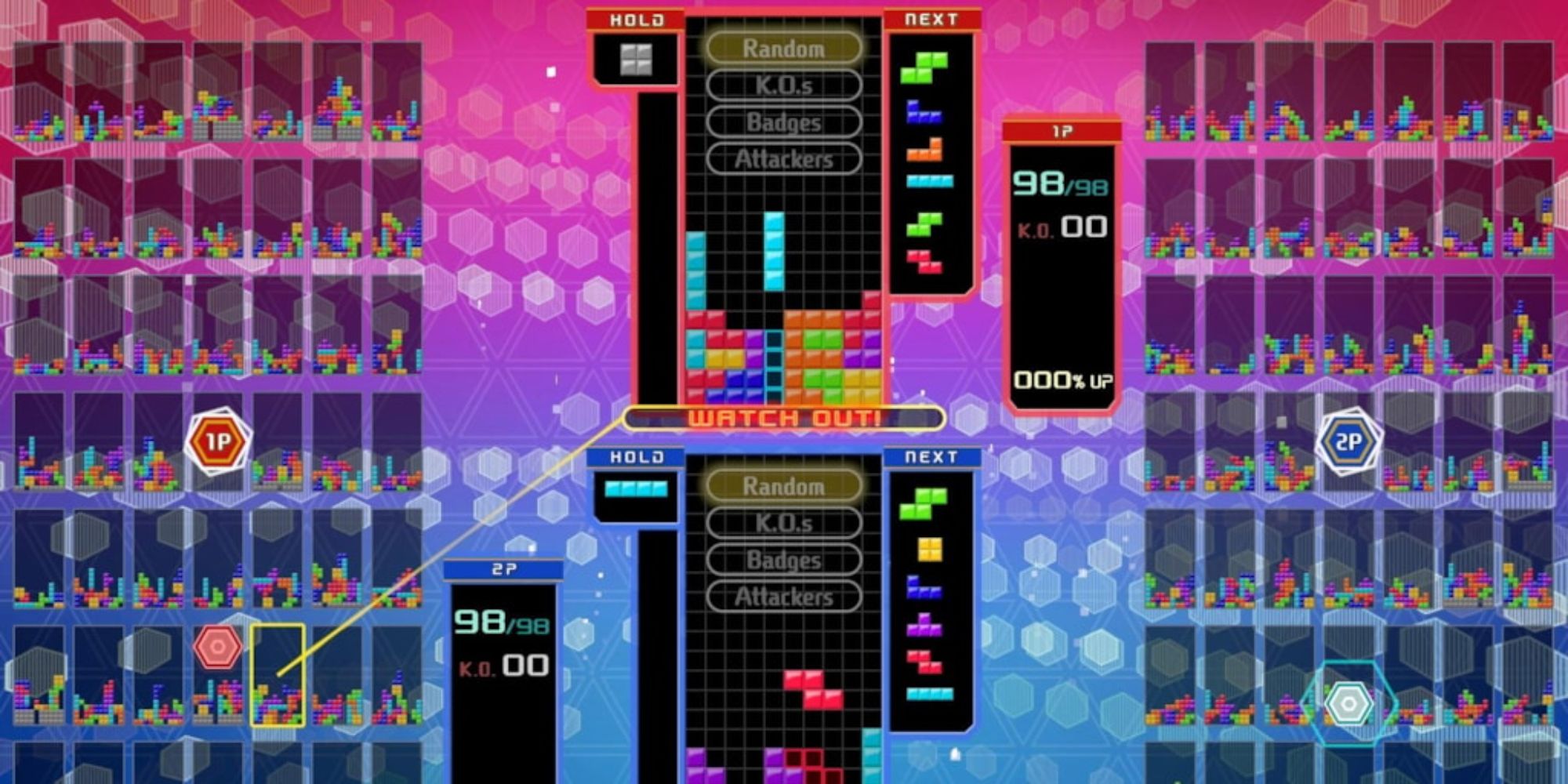 Tetris 99 предлагает вам сразиться с 98 другими игроками в битве, чтобы стать последним выжившим. Во время игры вы можете отправлять препятствия своим противникам, чтобы попытаться сорвать их игру и получить преимущество.