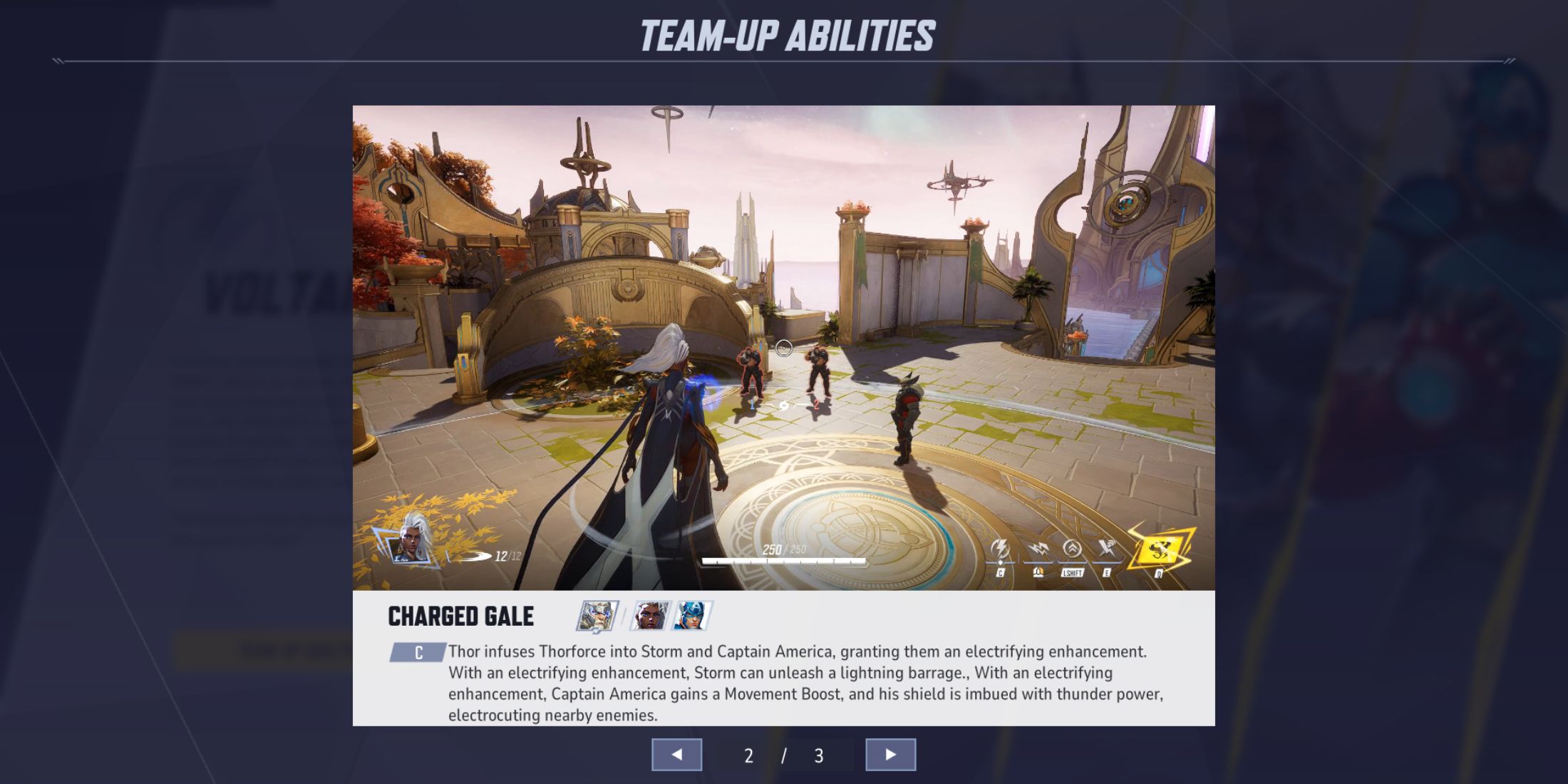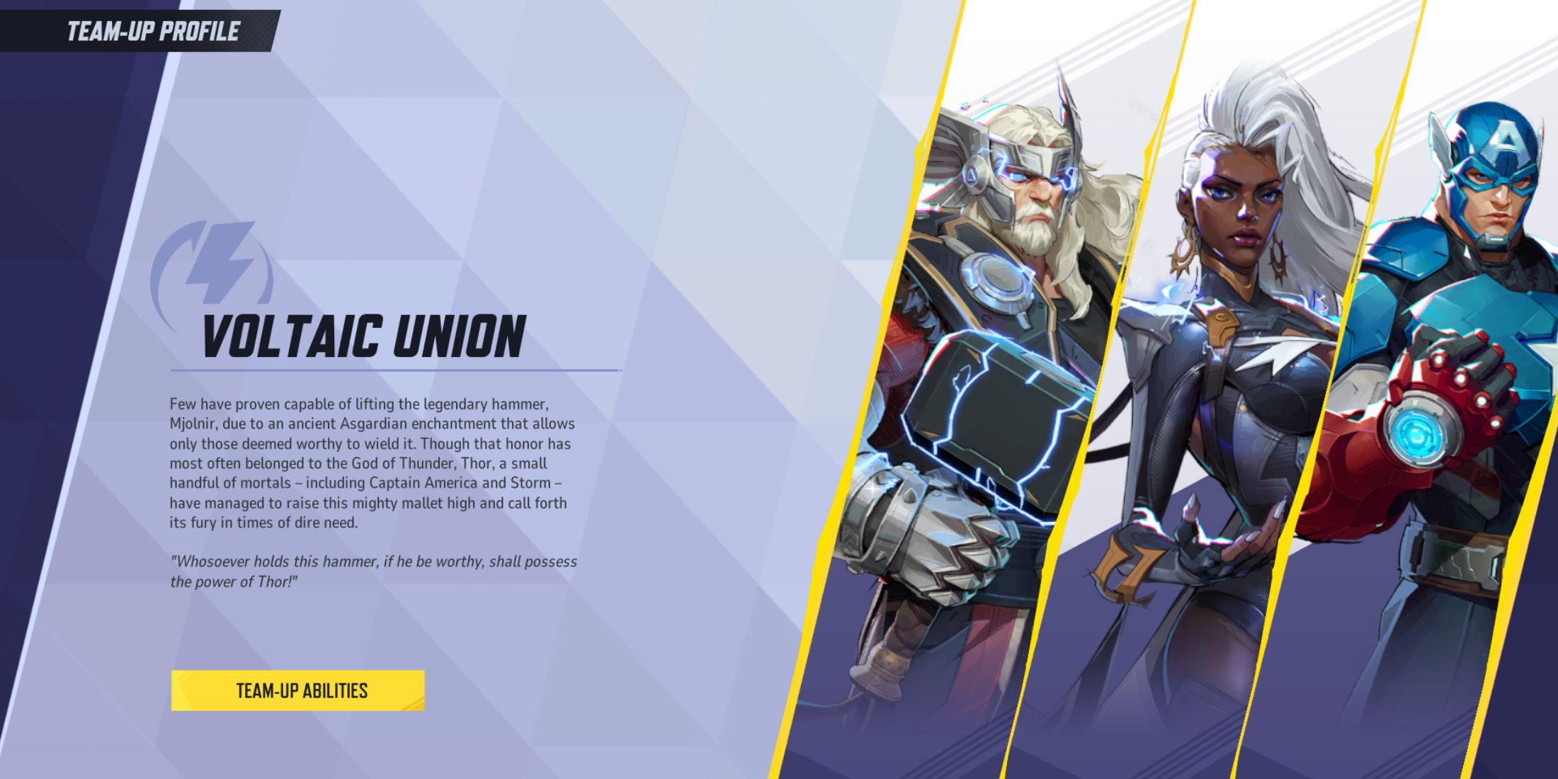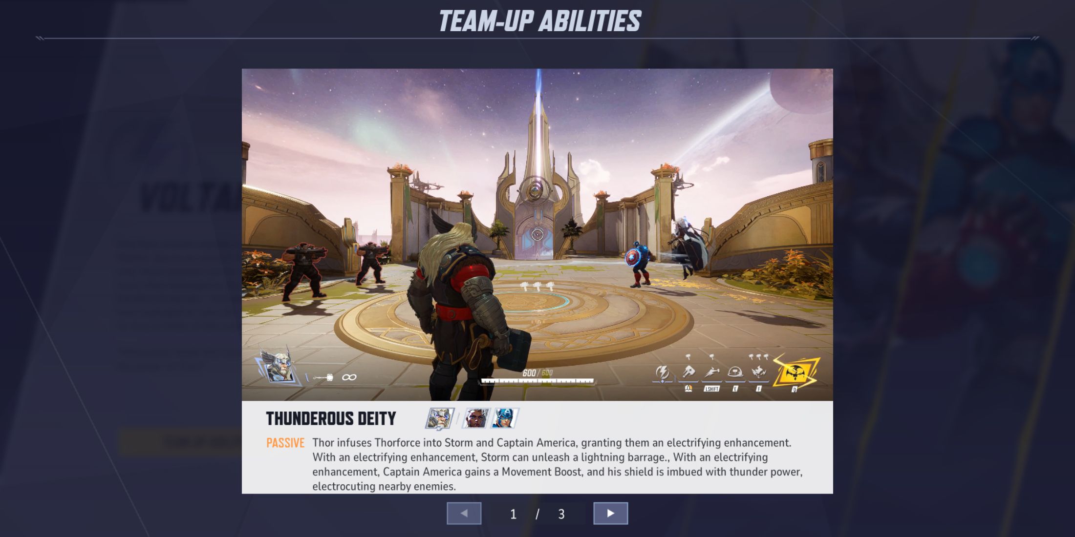Используя мощную ауру Тора, Шторм и Капитан Америка вместо этого получают электризующие улучшения. Шторм увеличивает силу своих молниеносных атак, а Капитан Америка ускоряет свои движения и оснащает электрически заряженным щитом, который трясет противников. Использование этих сильных эффектов позволяет командам запускать мощные волны, которые преодолевают оборону и разрушают линию наступления противника.