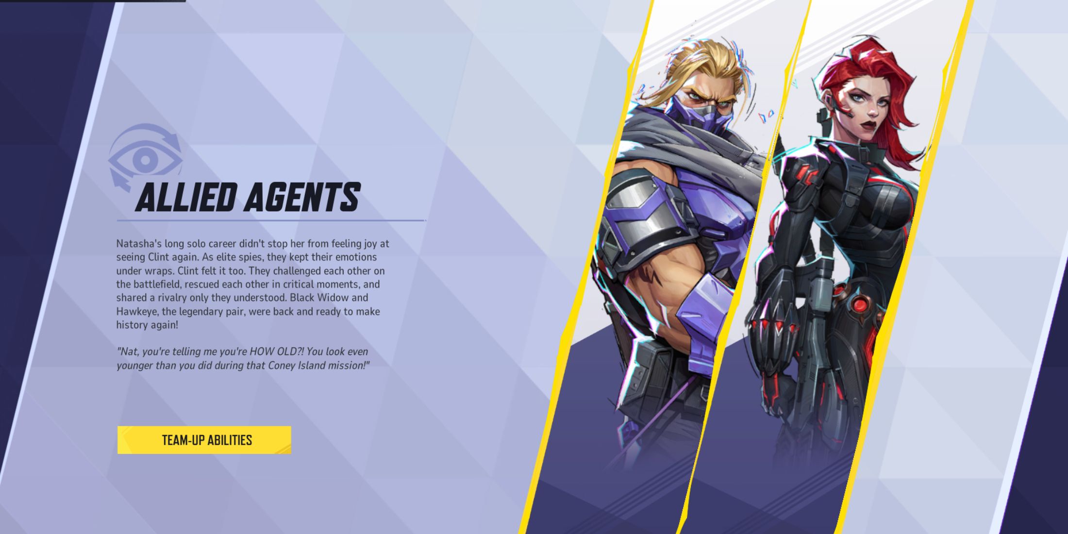 Враги с высокой маневренностью представляют собой серьезную проблему для снайперских навыков Черной Вдовы. Но когда в дело вступает Соколиный глаз, их сотрудничество внезапно выявляет и подчеркивает врагов, благодаря чему в них становится легче прицеливаться. Хотя этот период непродолжителен, он дает возможность совершать точные выстрелы, которые могут оказаться трудными для быстрых героев, постоянно перемещающихся по полю боя.