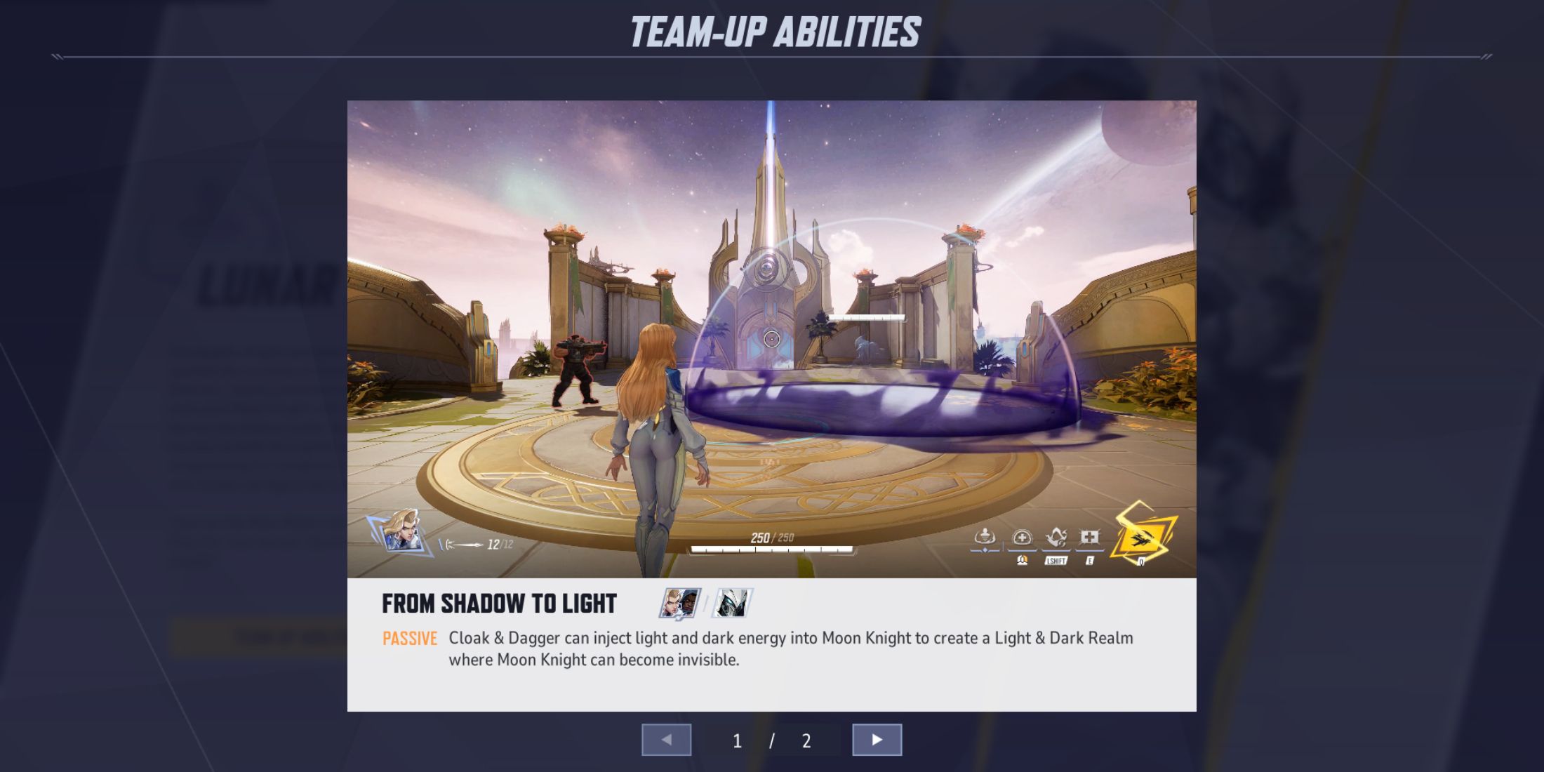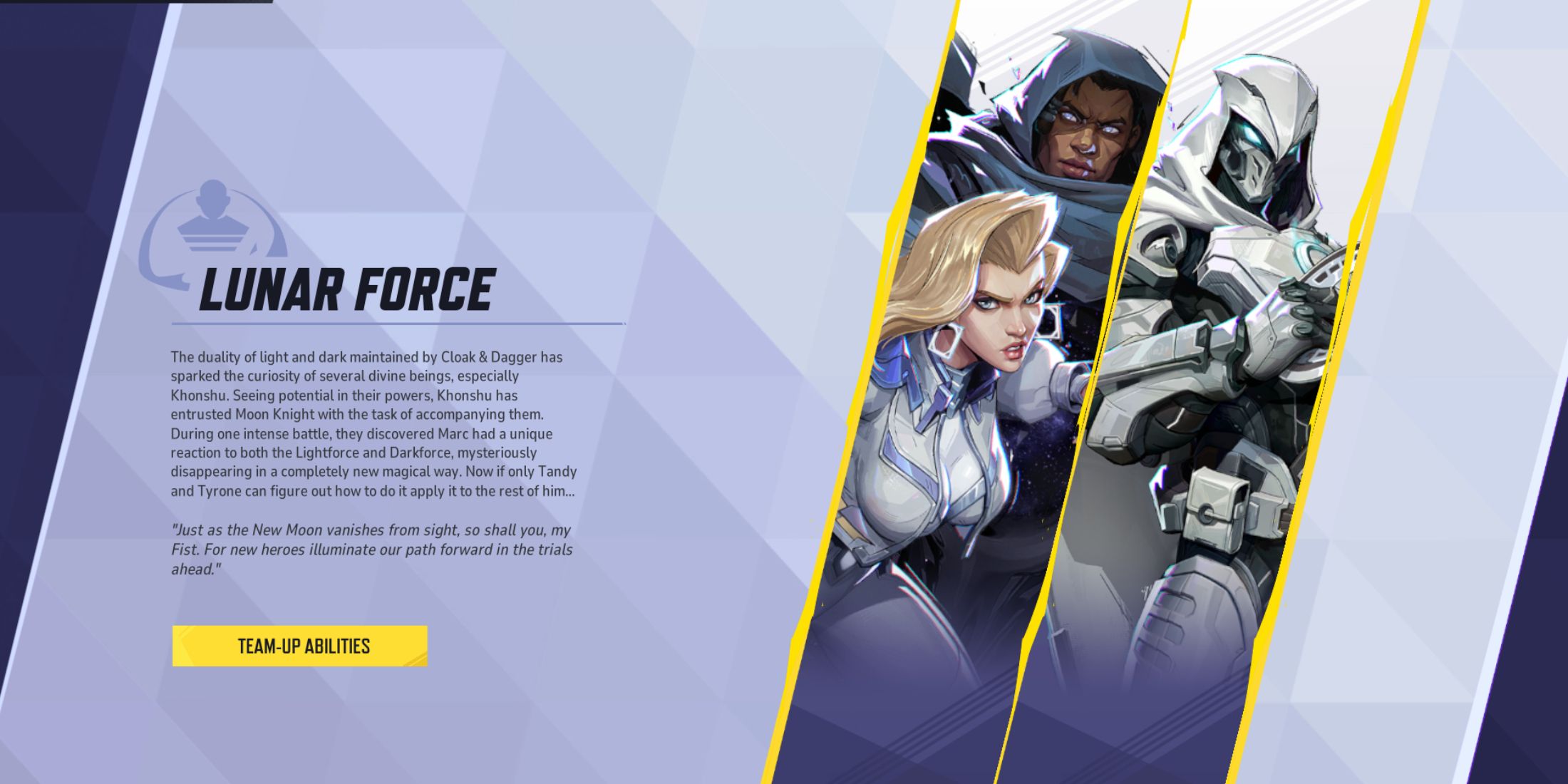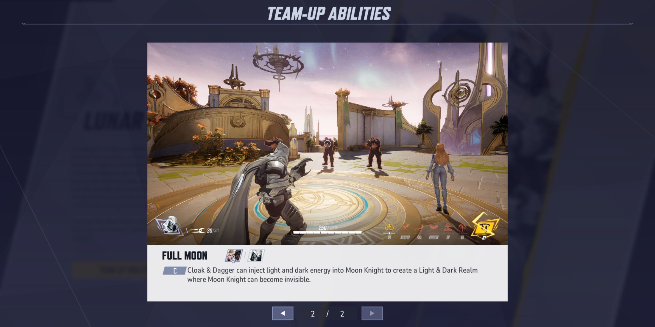 Лунный Рыцарь отлично умеет проникать в тыл врага и уничтожать важные цели, разбросанные по карте, но его видимость по-прежнему может представлять собой проблему. Однако, когда Плащ и Кинжал объединяются, синергия Лунной Силы дает Лунному Рыцарю возможность становиться невидимым, что упрощает застать ничего не подозревающих врагов врасплох. Этим застигнутым врасплох противникам часто бывает трудно быстро отреагировать, что позволяет быстро устранить их с минимальными нарушениями.