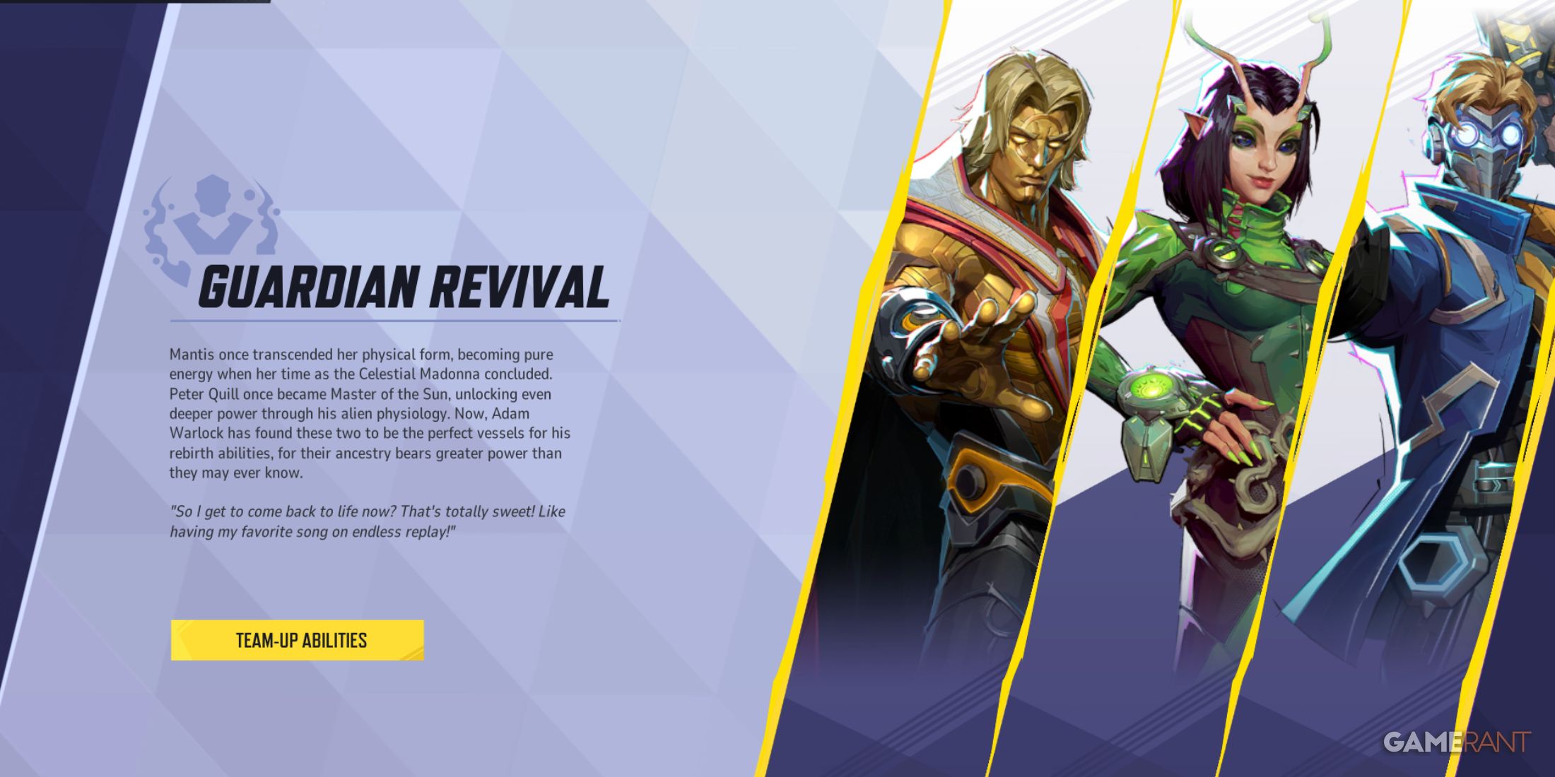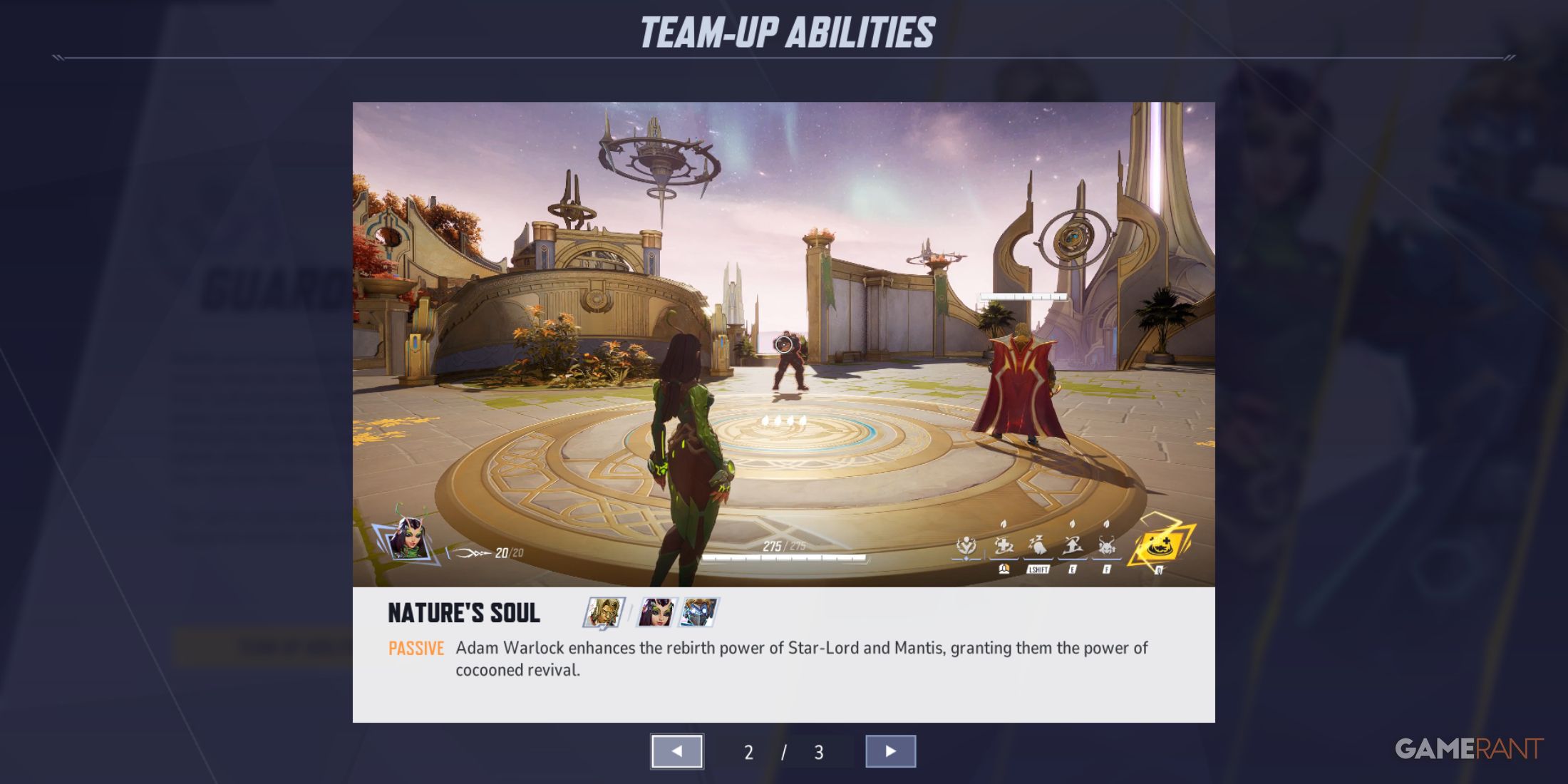 Команда, состоящая из Адама Варлока, Богомола и Звездного Лорда, обладает встроенной синергией, которая усиливает их индивидуальные способности. Адам Варлок и Богомол предлагают значительное исцеление, полезные утилиты и контроль толпы, что позволяет Звездному Лорду сиять на наступательных позициях. Способность «Возрождение стража» сводит к минимуму время простоя и поддерживает постоянный ритм, демонстрируя, как одна из самых сильных командных способностей может изменить ход боя, расширить стратегические возможности и повысить общую устойчивость во время напряженных схваток.