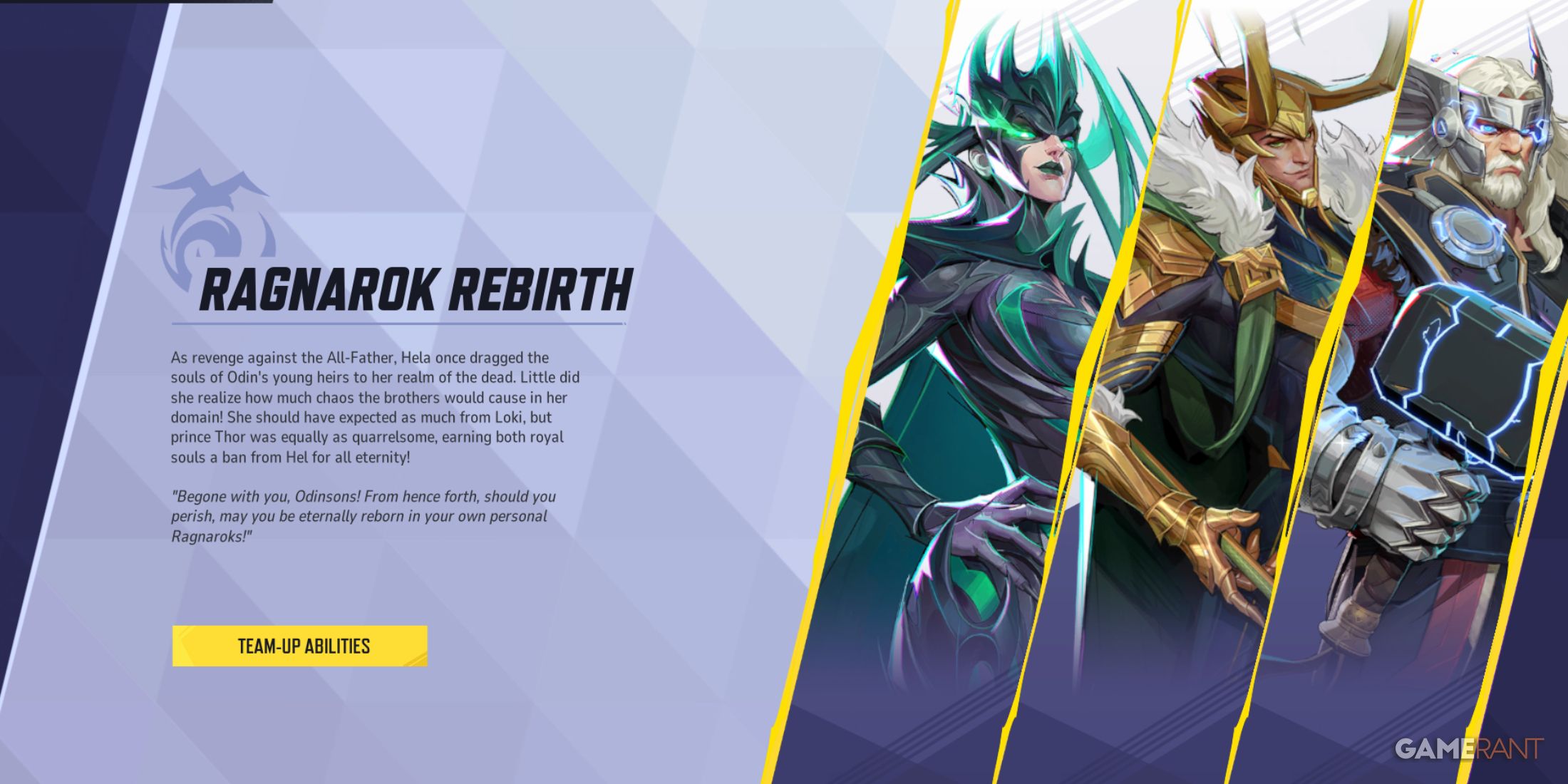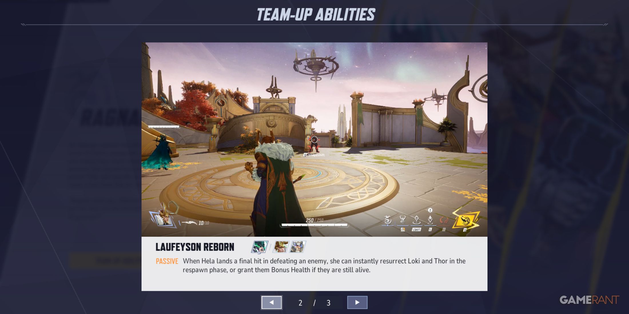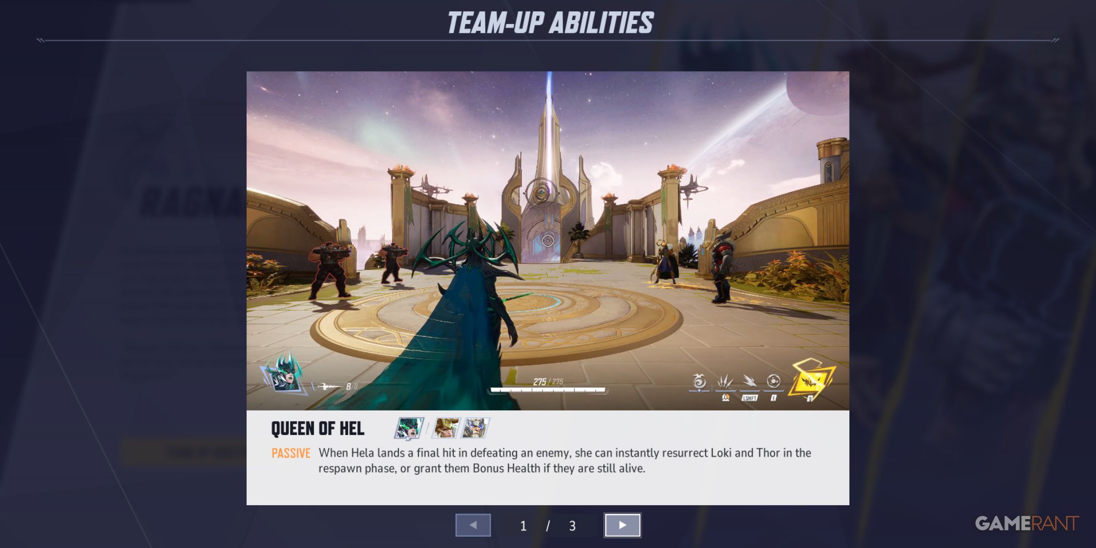Когда Тор и Локи сражаются, Хела накапливает силу, чтобы оживить убитых товарищей, ожидающих возрождения. Однако прежде чем активировать эту способность объединения в команду, Хела должна сначала добиться хотя бы одного уничтожения. Это требование обычно достижимо для опытных игроков, поскольку навыки Хелы могут нанести значительный урон при тактическом использовании.