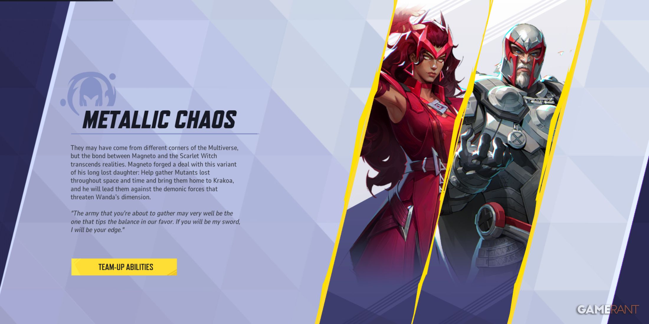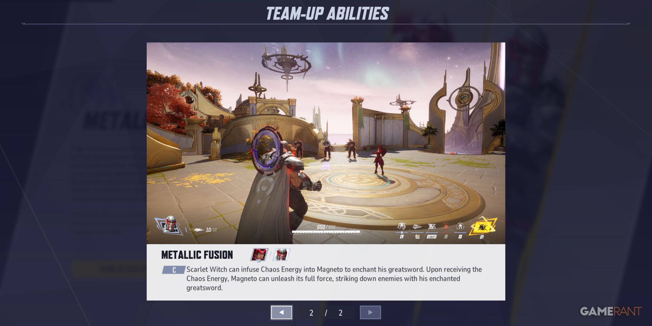 Магнето — мощная фигура на передовой, часто побеждающая врагов в рукопашном бою. Его сила значительно возрастает в сочетании с Алой Ведьмой. С помощью магии, пропитанной его мечом, Магнето наносит тяжелые удары, которые разрывают ослабленных врагов, пытающихся убежать, превращая ближний бой в быстрые и беспощадные стычки.