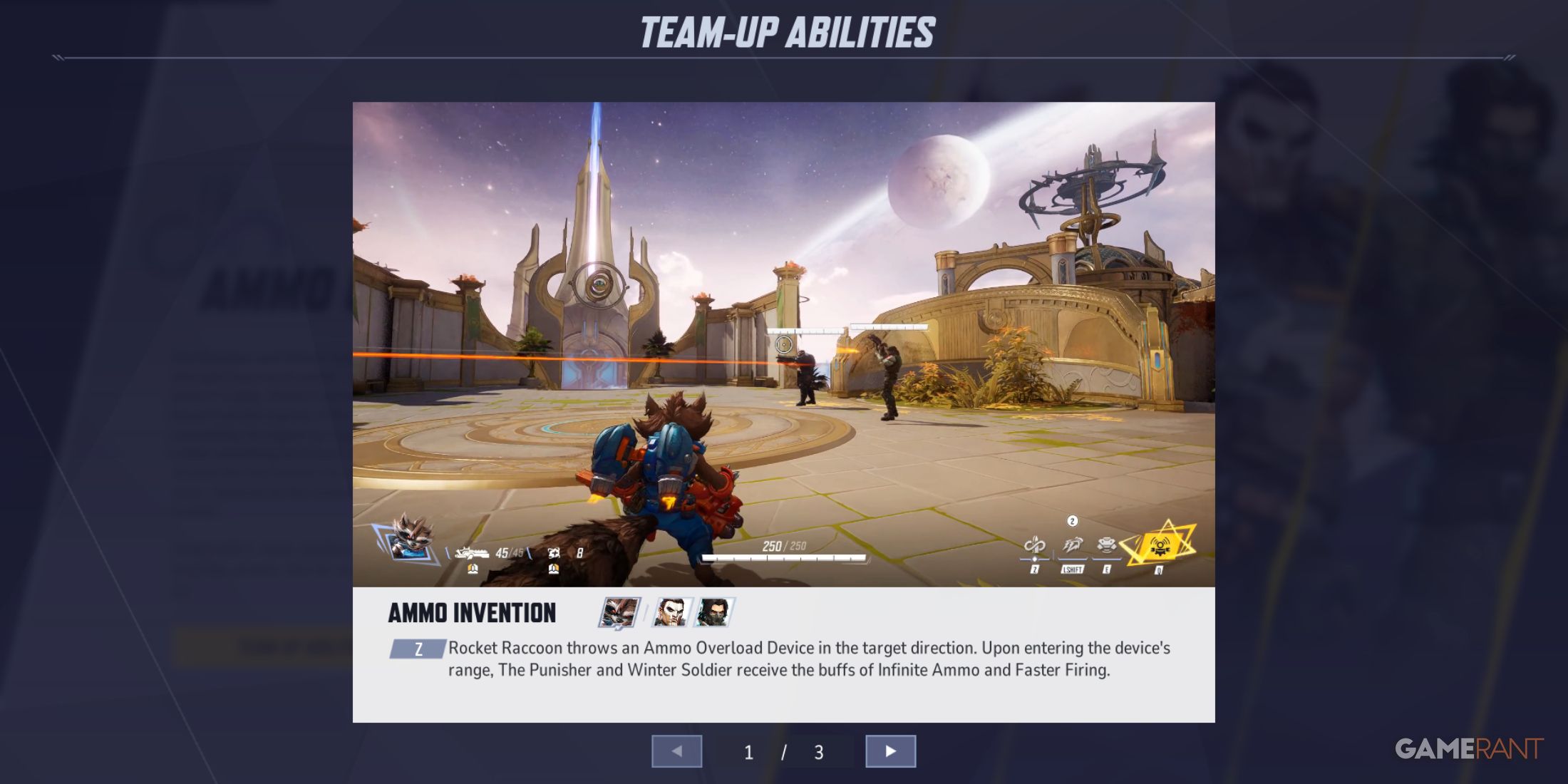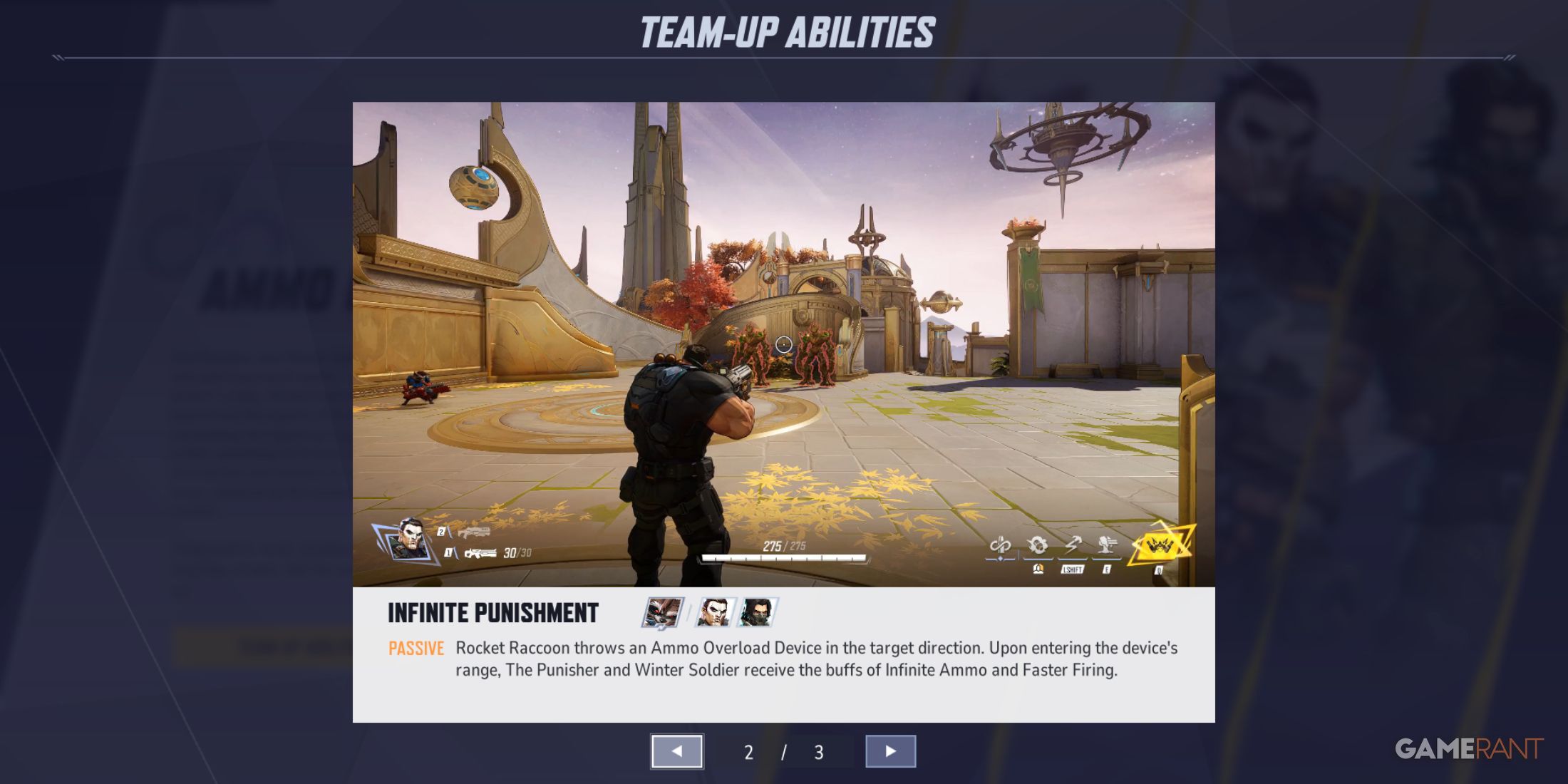 В команде с Ракетным Енотом ограничения на боеприпасы для таких персонажей, как Зимний Солдат и Каратель, смягчаются способностью под названием «Перегрузка боеприпасов». Когда они находятся рядом с Ракетой, эти два могущественных персонажа получают выгоду от бесконечного количества боеприпасов и более высокой скорострельности, что позволяет им обрушивать поток непрерывной огневой мощи, максимизируя присущий им разрушительный потенциал.