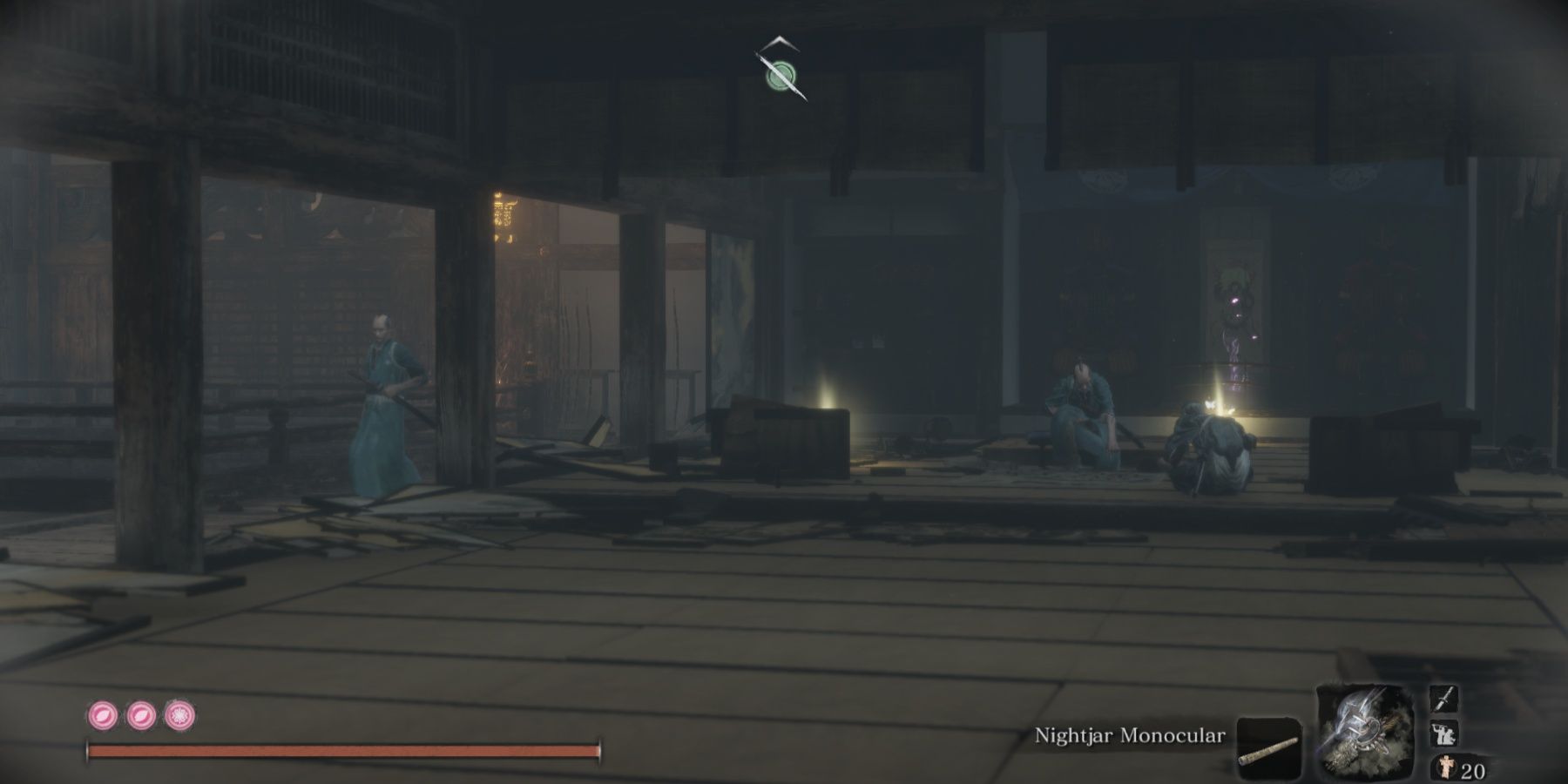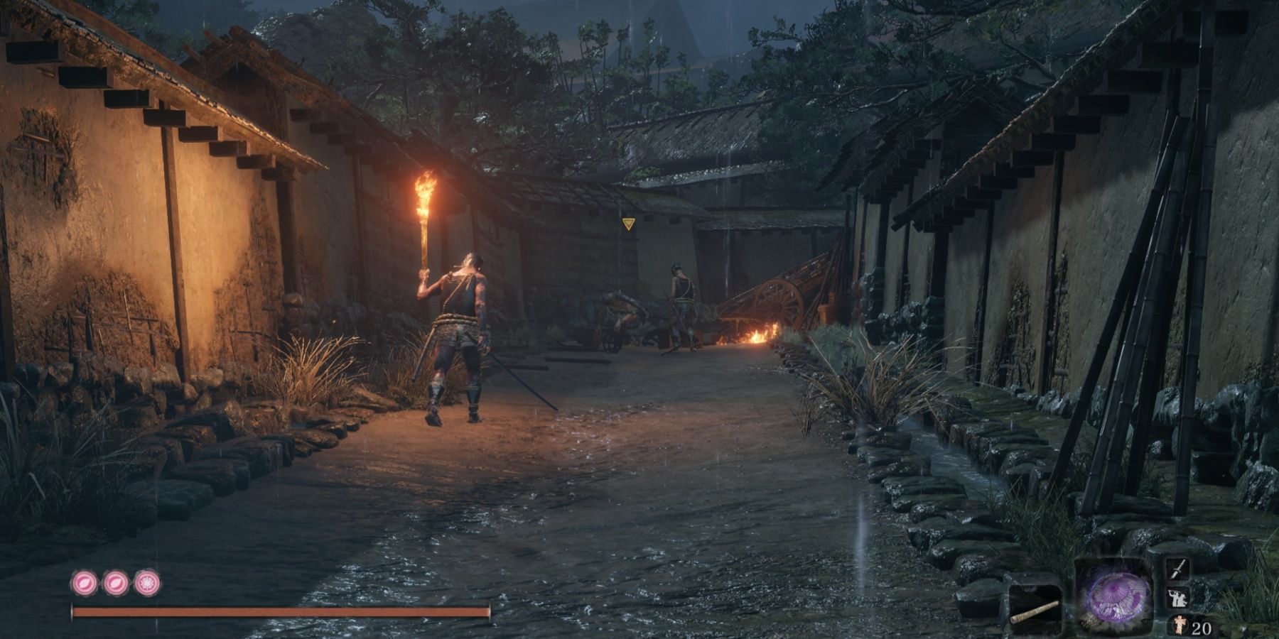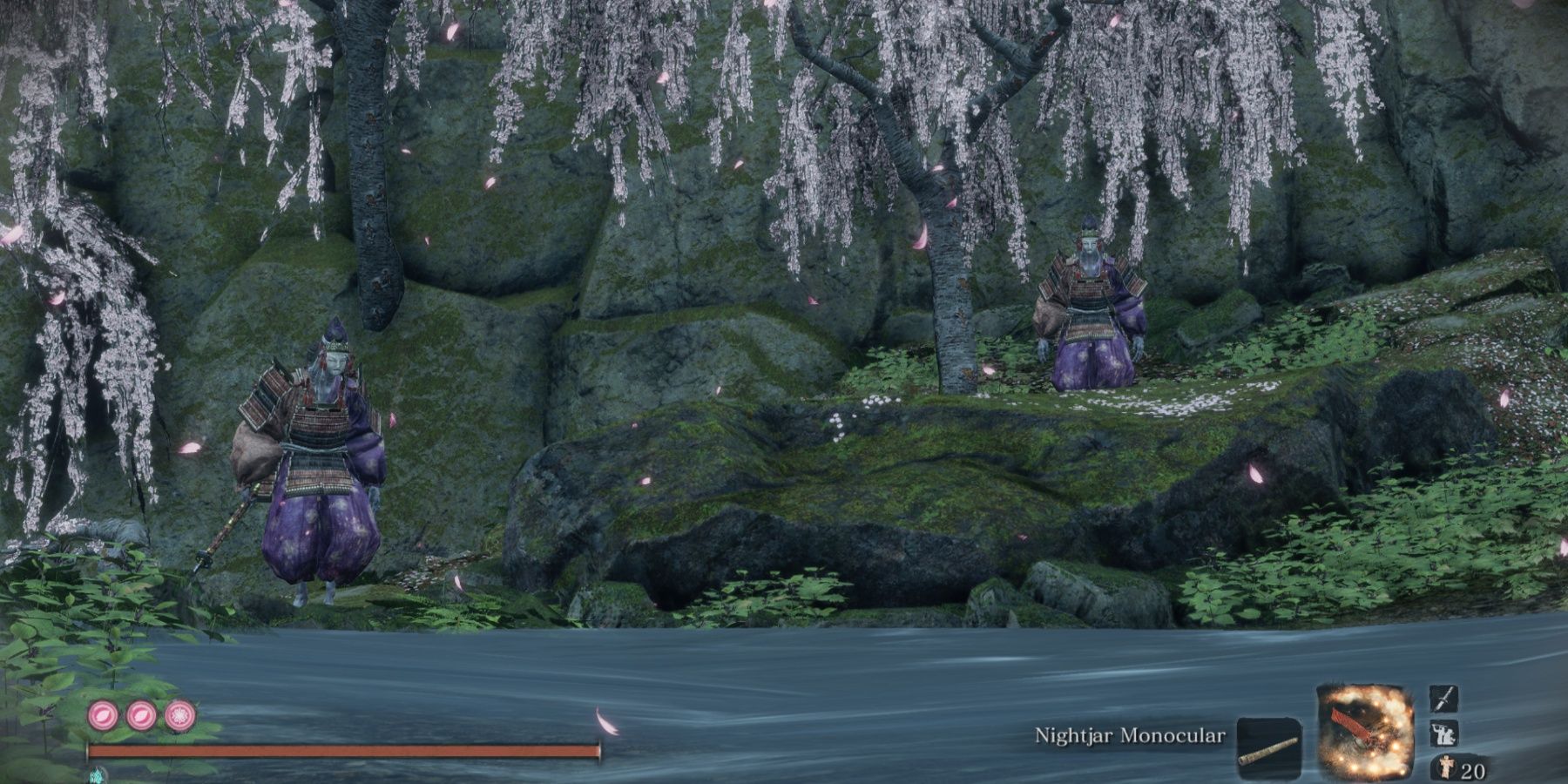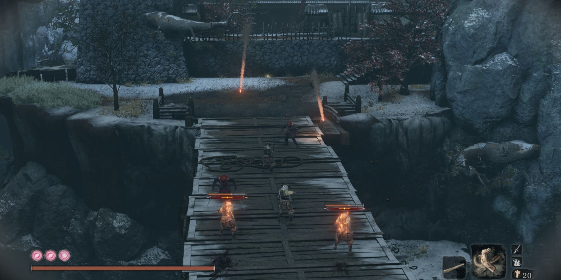 Со стороны почитаемого идола вы увидите трех воинов Оками — двоих, стоящих близко друг к другу, и одного, стоящего немного в стороне. Одинокий воин представляет меньшую проблему, поскольку он не препятствует, но пара, собравшаяся вместе, может. В такой ситуации протезный инструмент оказывается неоценимым, особенно Сабимару с его пронзительным улучшением. Продолжайте спамить Сабимару до тех пор, пока эти противники не будут побеждены или их решимость не ослабнет настолько, что вы сможете уничтожить их обычным способом.