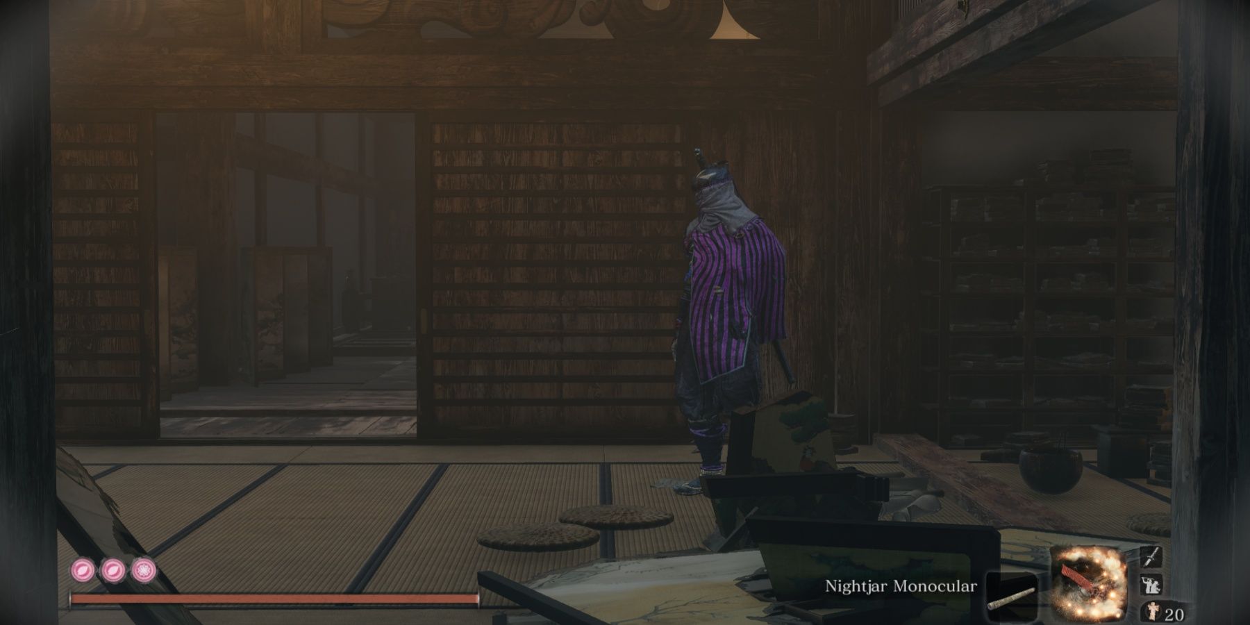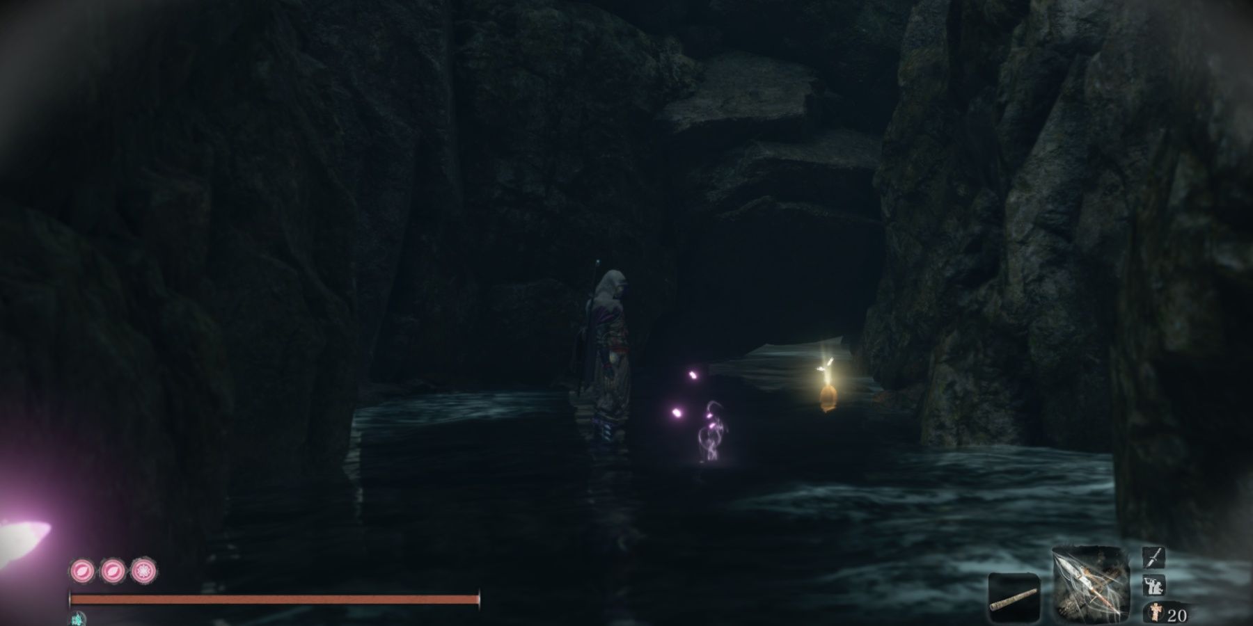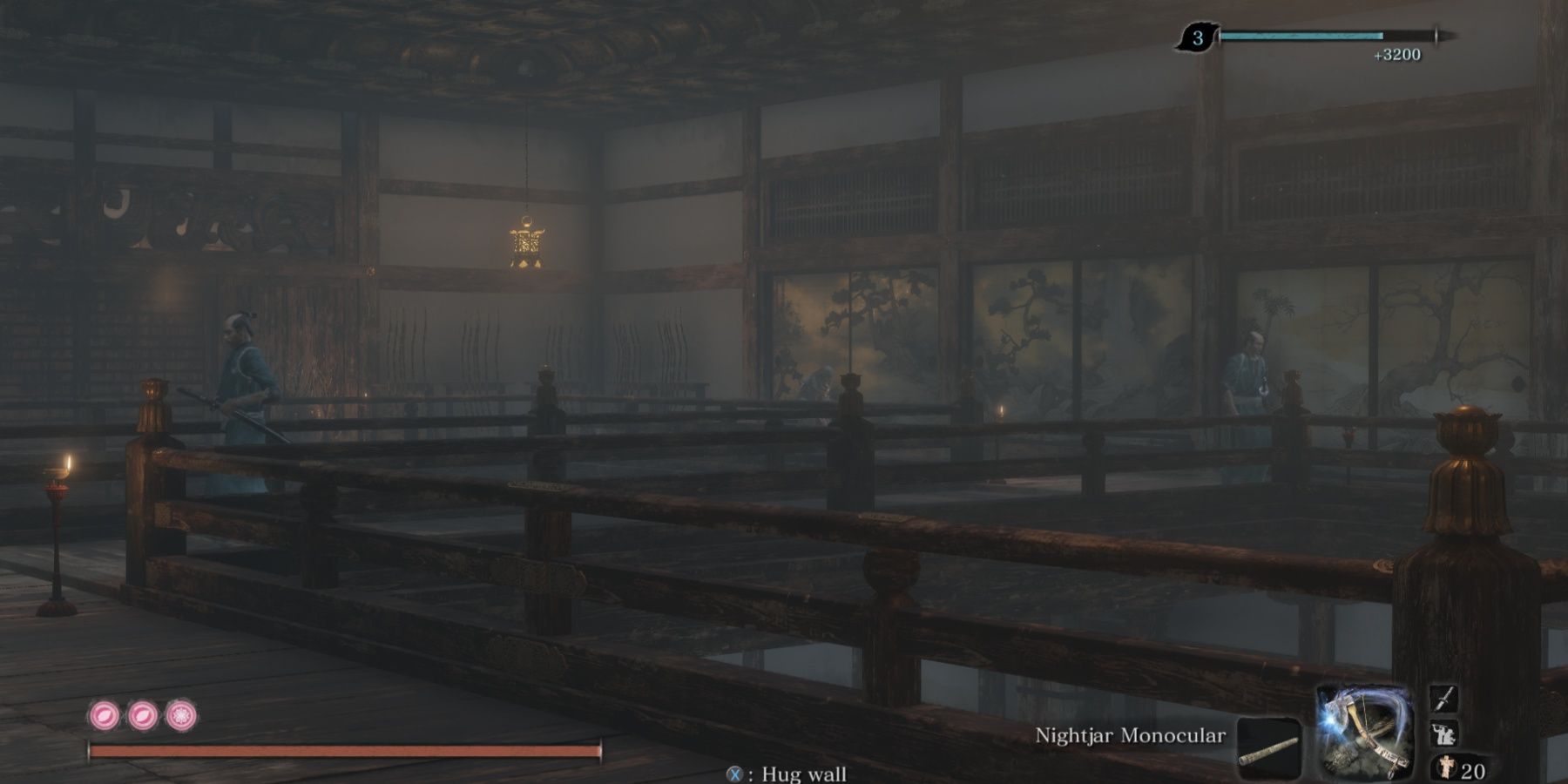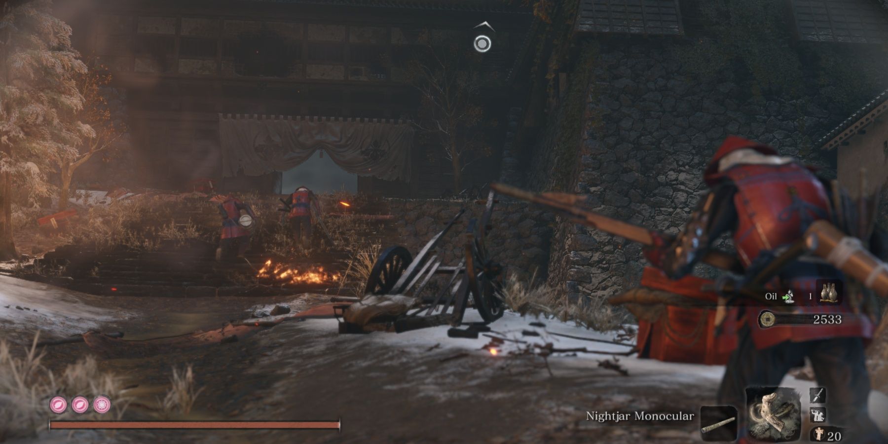 Со стороны почитаемого идола вы увидите трех воинов Оками — двоих, стоящих близко друг к другу, и одного, стоящего немного в стороне. Одинокий воин представляет меньшую проблему, поскольку он не препятствует, но пара, собравшаяся вместе, может. В такой ситуации протезный инструмент оказывается неоценимым, особенно Сабимару с его пронзительным улучшением. Продолжайте спамить Сабимару до тех пор, пока эти противники не будут побеждены или их решимость не ослабнет настолько, что вы сможете уничтожить их обычным способом.