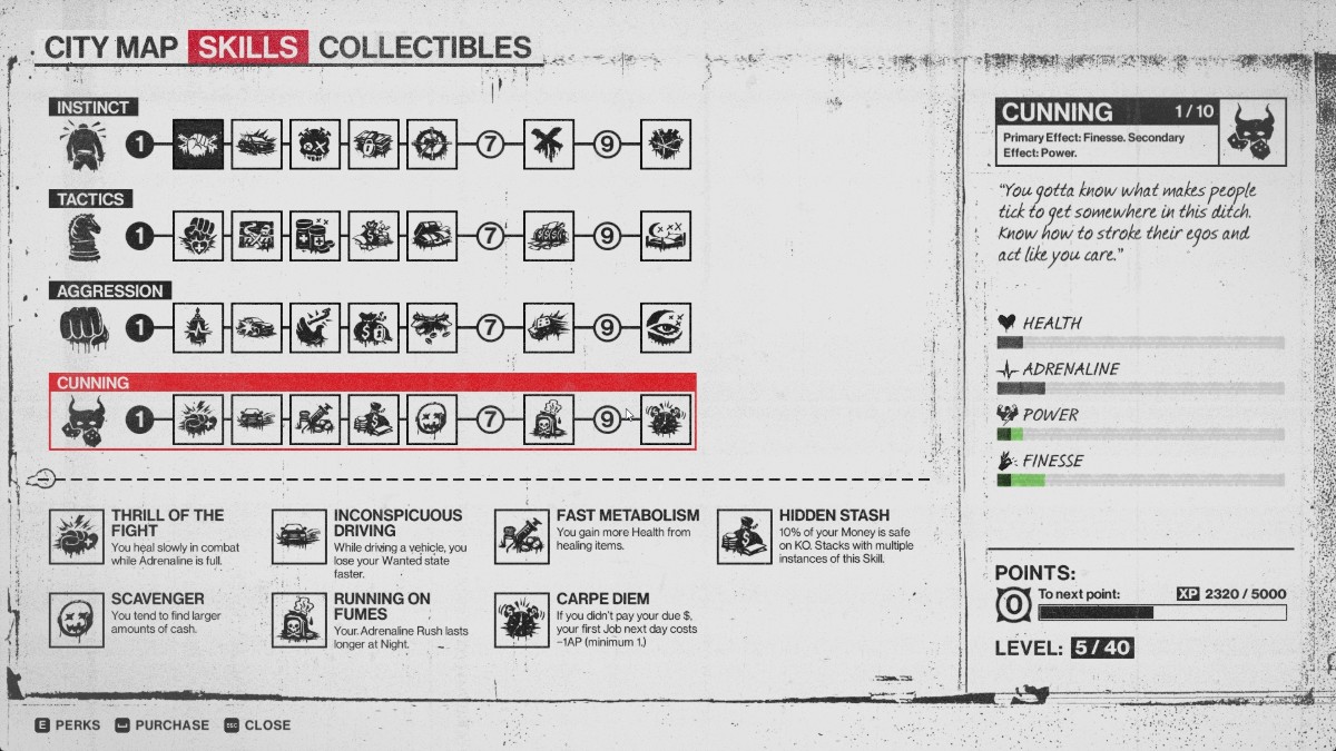 Сердце из стали (Инстинкт) – Один раз за игру, если вы собираетесь потерять сознание, вы можете вместо этого восстановить немного здоровья и вернуть часть Адреналина.