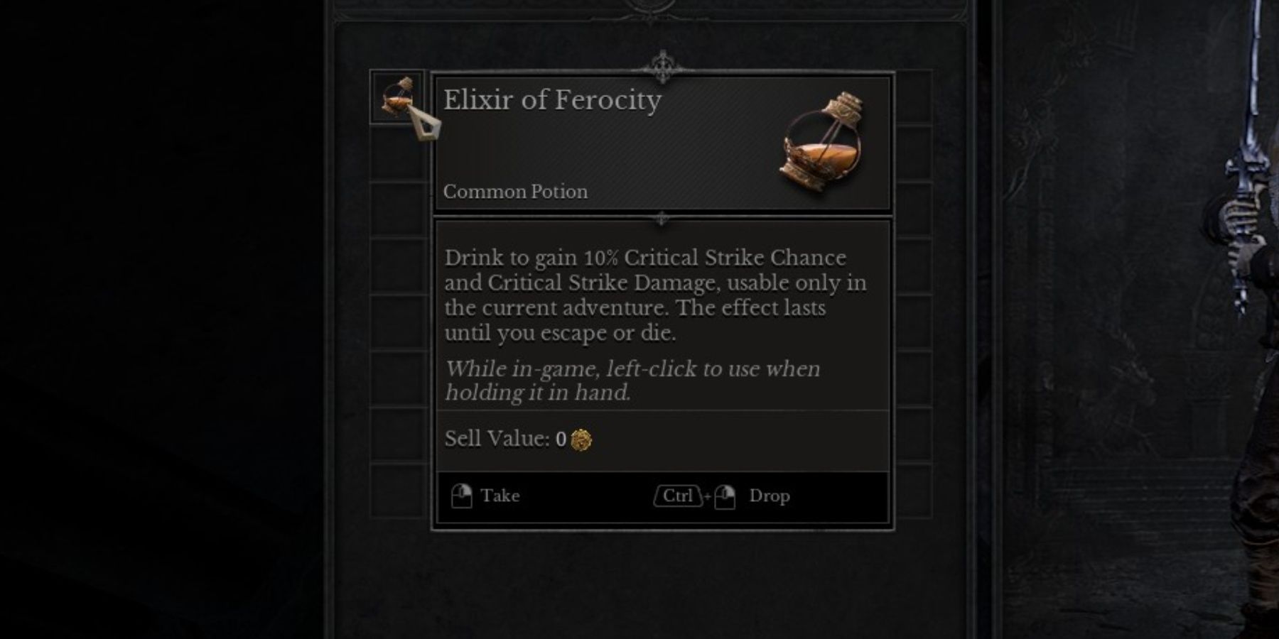 Зелье, спрятанное в подземельях, при употреблении во время игры увеличивает пассивное восстановление здоровья на протяжении всего забега. Эти зелья нельзя вынести из подземелья, их нужно найти и использовать внутри него. Несмотря на это ограничение, они остаются ценными, поскольку игроки могут выпить до трех зелий, каждое из которых дает накопительный эффект, улучшающий игровой процесс в подземелье.