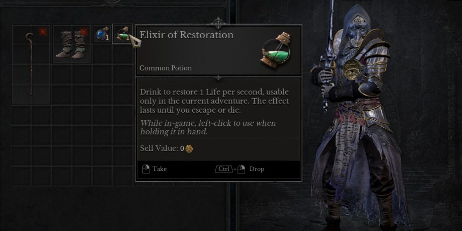 Эликсир восстановления постоянно восстанавливает 1 очко здоровья каждую секунду на протяжении всего вашего путешествия. Однако после употребления или в случае вашей смерти его эффекты исчезают, а это означает, что вам придется выпить еще одну, если вы встретите свою смерть, находясь под его влиянием. Кроме того, имейте в виду, что преимущества «Эликсира восстановления» могут суммироваться с аналогичными преимуществами, такими как чары, исцеление вне боя, зелья здоровья и положительные эффекты от алтарей исцеления.
