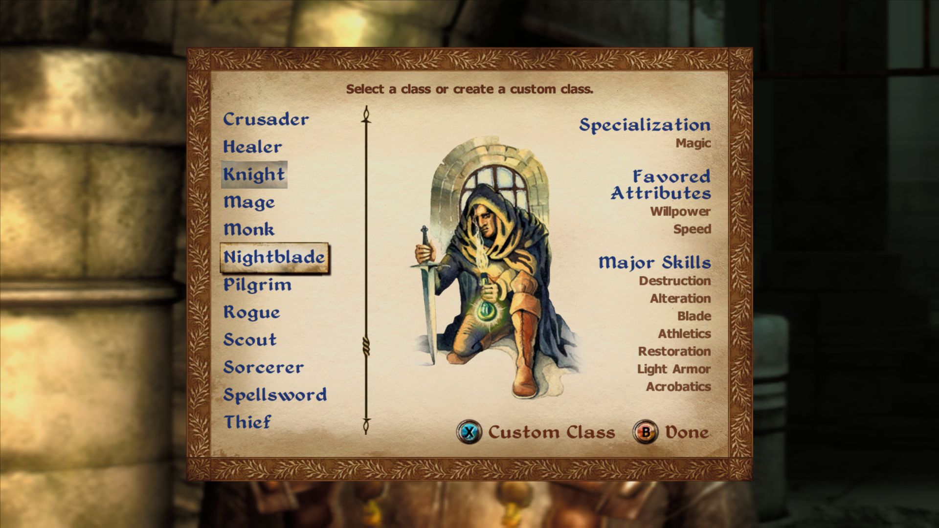 Чтобы создать ночного персонажа в этой игре, вам нужно будет принимать несколько ключевых решений в течение первого часа игры. Прежде чем отправиться в Cyrodiil, вы должны выбрать и завершить свою расу, родовой песни и класс. Выбран ваш класс значительно формирует вашего персонажа в Cyrodiil. Для ночной сборки оптимальный выбор — сам класс «Nightblade». Хотя вы можете создать пользовательский класс и выбрать свои собственные атрибуты, Nightblade Class Naturally предлагает атрибуты скорости и силы воли, что делает его идеальной отправной точкой для создания надежного ночного персонажа.