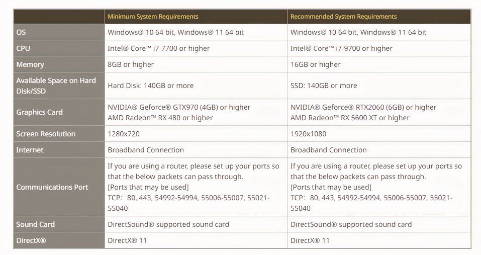 Final Fantasy 14 имеет более умеренные характеристики оборудования, чем многие другие игры 2024 года, из-за широкой базы игроков. Игра оснащена продвинутыми текстурами высокой четкости, которые могут быть требовательны к компонентам компьютера, особенно к графическим процессорам, которые должны иметь минимум 4 ГБ видеопамяти. Рекомендуемое оборудование включает Nvidia RTX 2060 или AMD RX5600XT, каждая из которых оснащена 6 ГБ видеопамяти.