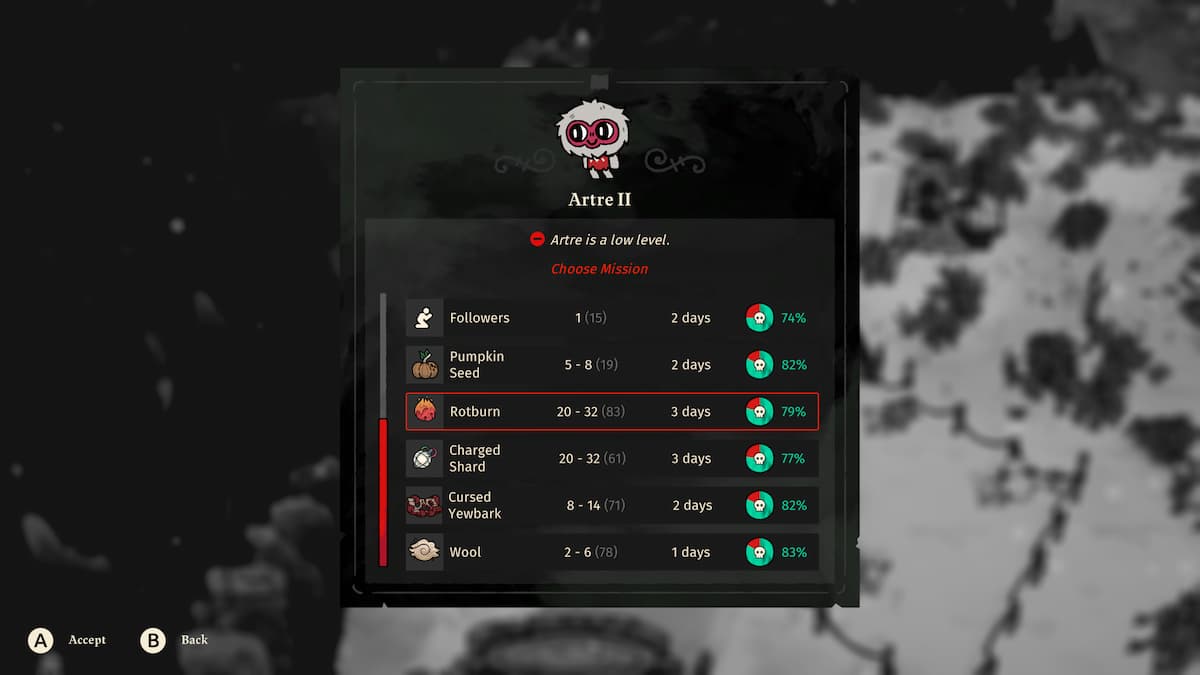 После создания Миссионера вы можете отправлять последователей на задания для сбора различных ресурсов, включая Rotburn. Поскольку Rotburn легче найти, когда не холодно, обязательно отправьте некоторых последователей собрать его сейчас.