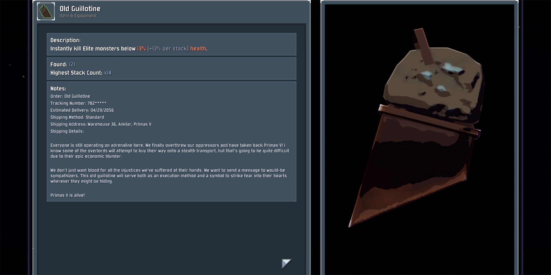 Древняя гильотина универсальна независимо от типа персонажа игрока. Это уменьшает количество урона, необходимого для уничтожения элитных врагов, что делает их более управляемыми для игроков. Это особенно полезно при работе с боссами-телепортами в поздней игре, которые сами могут быть элитными. Старая гильотина уменьшает эффективный запас здоровья элиты на процент, поэтому ее влияние возрастает с увеличением уровня здоровья. Однако он может не работать оптимально на персонаже-Ремесленнике, поскольку ее способности имеют аналогичный эффект и не суммируются со Старой гильотиной. Тем не менее, несколько стаков Старой гильотины могут значительно облегчить проблемы в поздней игре.