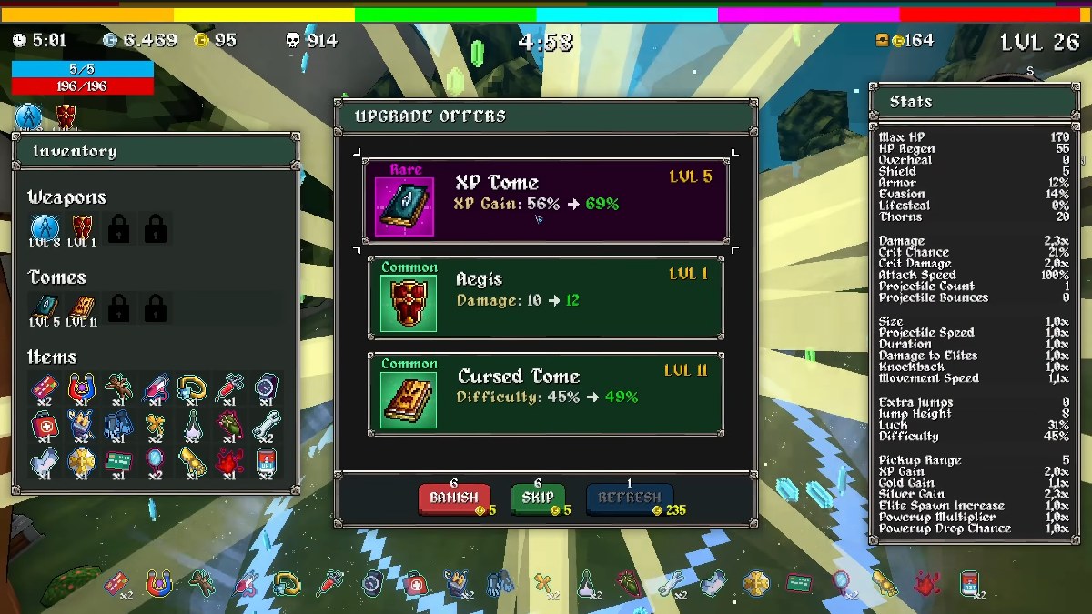 Как огромный фанат, я обнаружил, что Damage необходим для устранения недостатков Мегачада и обеспечения стабильно высокого урона. Я также клянусь в XP Tome — он позволяет вам намного быстрее повышать уровень! И Luck Tome отличный, потому что он увеличивает награды, которые вы получаете от такого быстрого повышения уровня. Если вы действительно хотите оптимизировать вещи, Cooldown Tome меняет правила игры; он практически устраняет время восстановления его пассивной способности, Aegis, и Aura проков. Но, если вы профессионал и знаете, что делаете, Cursed Tome дает вам наилучшие результаты.