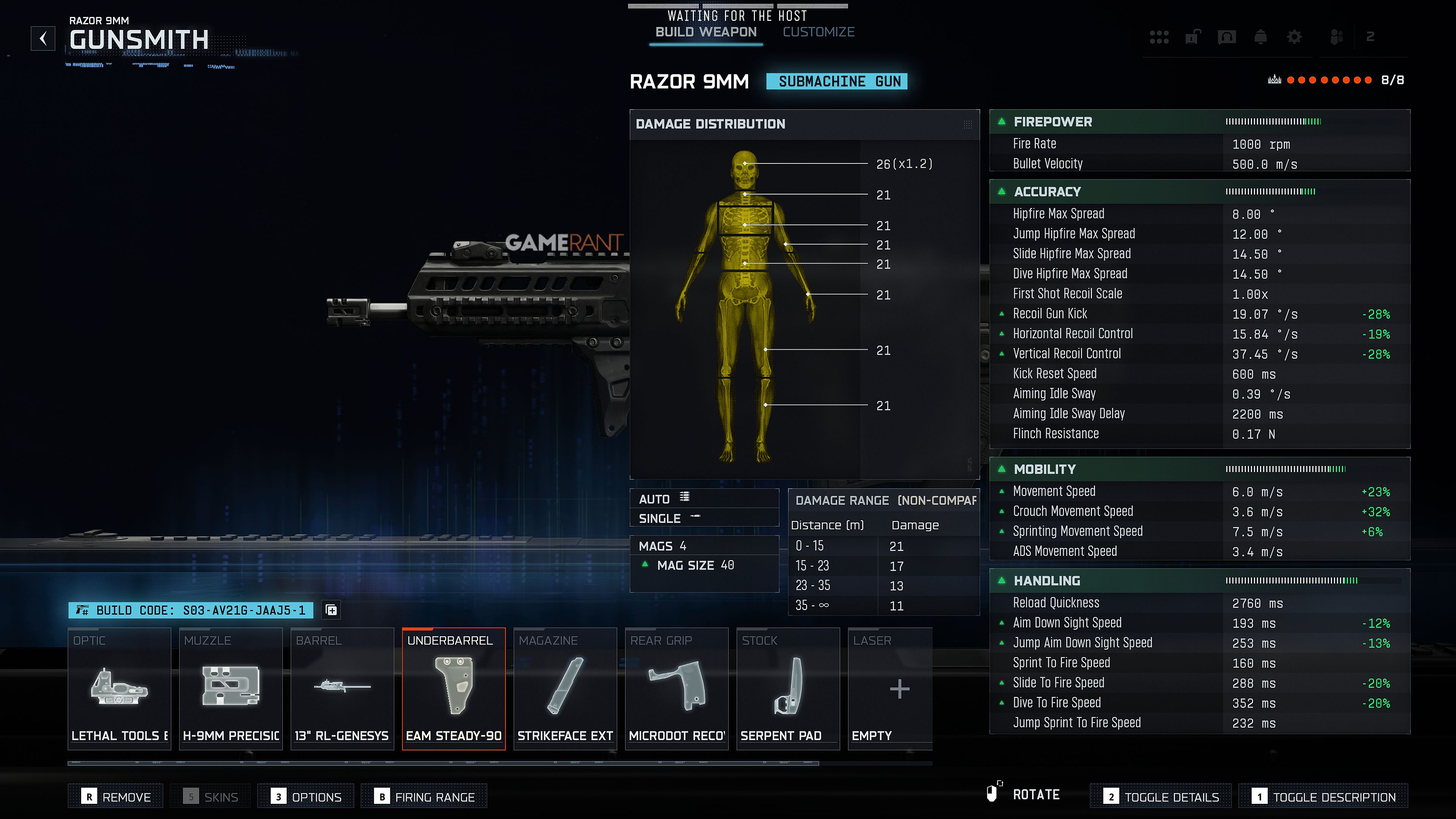 Razor 9mm – одно из самых быстрых автоматических пистолетов-пулемётов на близких дистанциях – до 12 метров – сопоставимое по скорости с MPC-25. Однако им сложно управлять из-за сильной вертикальной отдачи, и он быстро расходует боеприпасы. Ознакомьтесь с рекомендациями ниже, чтобы узнать, как лучше его настроить.