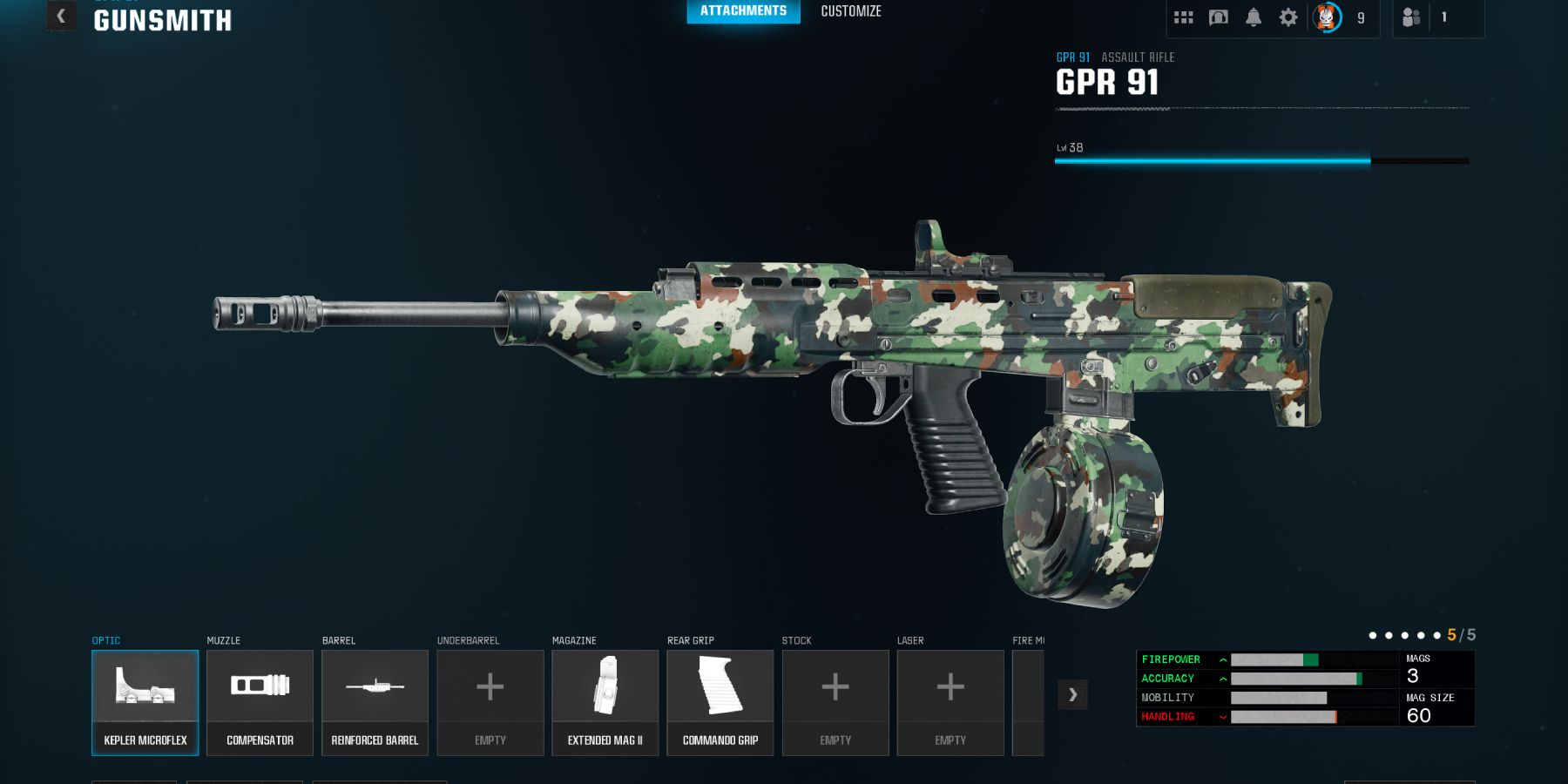 В такой игре как Warzone, когда вы используете большую и неудобную снайперскую винтовку, крайне важно иметь вторичное оружие, которое отлично справляется в ближнем бою и на средних дистанциях. Выделяющимся выбором является GPR-91 из Black Ops 6. Это штурмовая винтовка обладает впечатляющими базовыми характеристиками управления, такими как высокая скорость бега и быстрое прицеливание, что особенно полезно, когда противники приближаются к вашему местоположению. Кроме того, можно рассмотреть CR-56 в аналогичной роли. Выбранные мной модификации улучшают характеристики управления оружием, минимизируют значительный вертикальный откат и увеличивают вместимость магазина до 60 патронов.