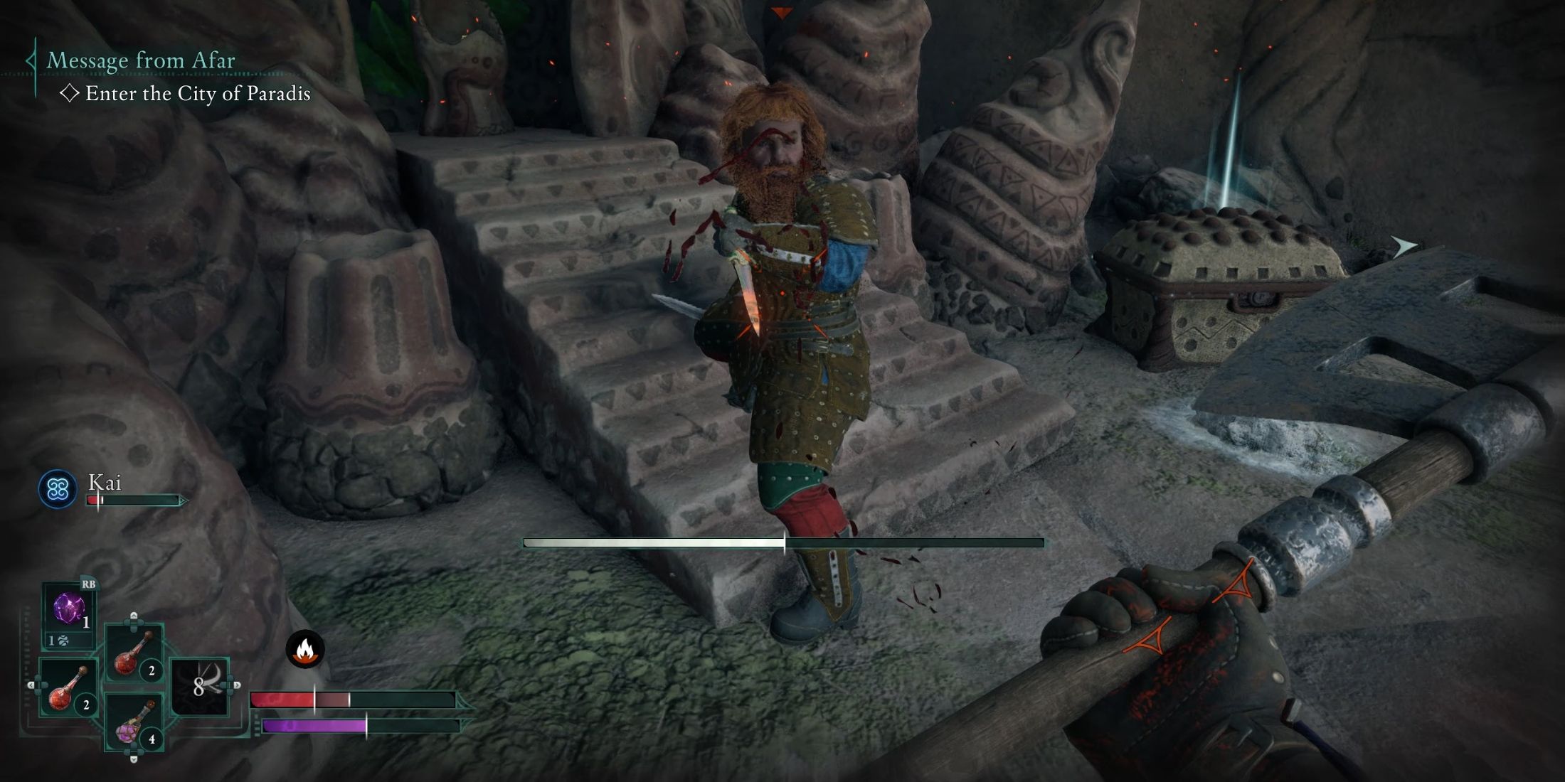 Когда вы попадаете в зону, вы заметите группу воинов -карв во главе с Октавом, стратегически расположенной среди безбожных руин. Вместо того, чтобы противостоять им в лоб, попытайтесь проскользнуть мимо этих противников и нанести мощный удар прямо в Октав. Как только враги будут заняты, ваши союзники зайдут, чтобы защитить вашу спину.