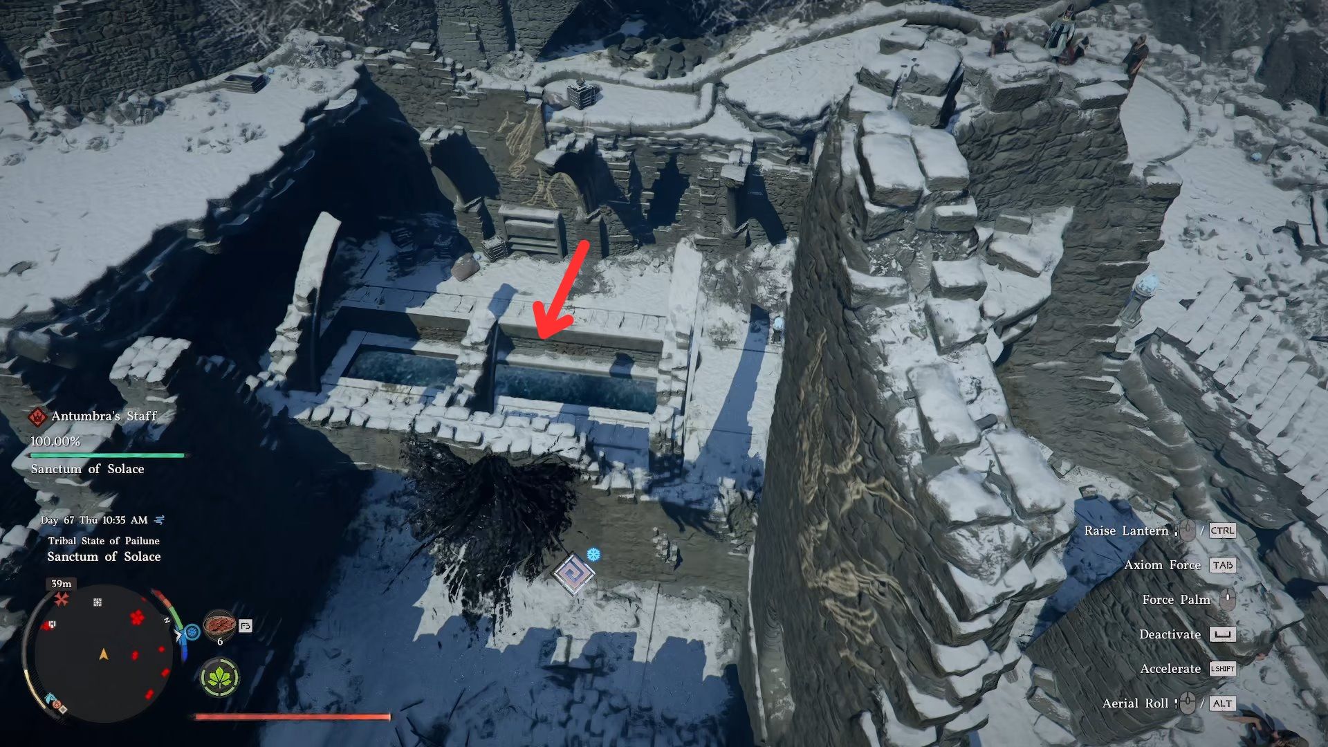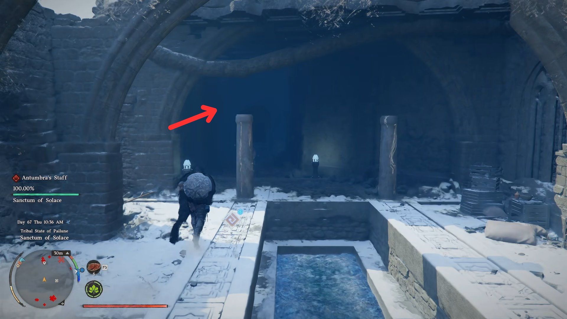 - Найдите небольшой прямоугольный водоём в центре Святилища и направляйтесь туда. Это будет самая нижняя часть Святилища, расположенная рядом с каменным мостом, возвышающимся над глубокой пропастью, прямо рядом с разрушенной башней.
