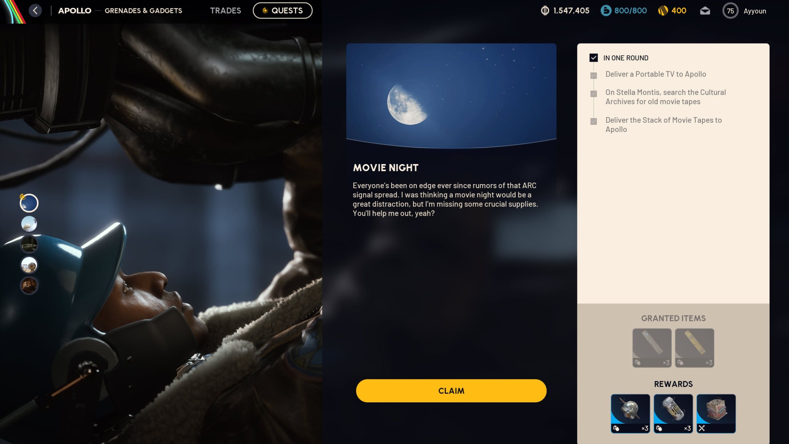 Как только вы получите Портативный телевизор и Старые киноплёнки для Аполлона, вы сможете завершить с ним задание. Выполнение задания Ночь кино в ARC Raiders наградит вас 3 гранатами Showstopper, 3 дымовыми гранатами и Коробкой с фейерверками.